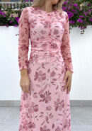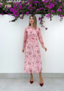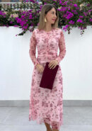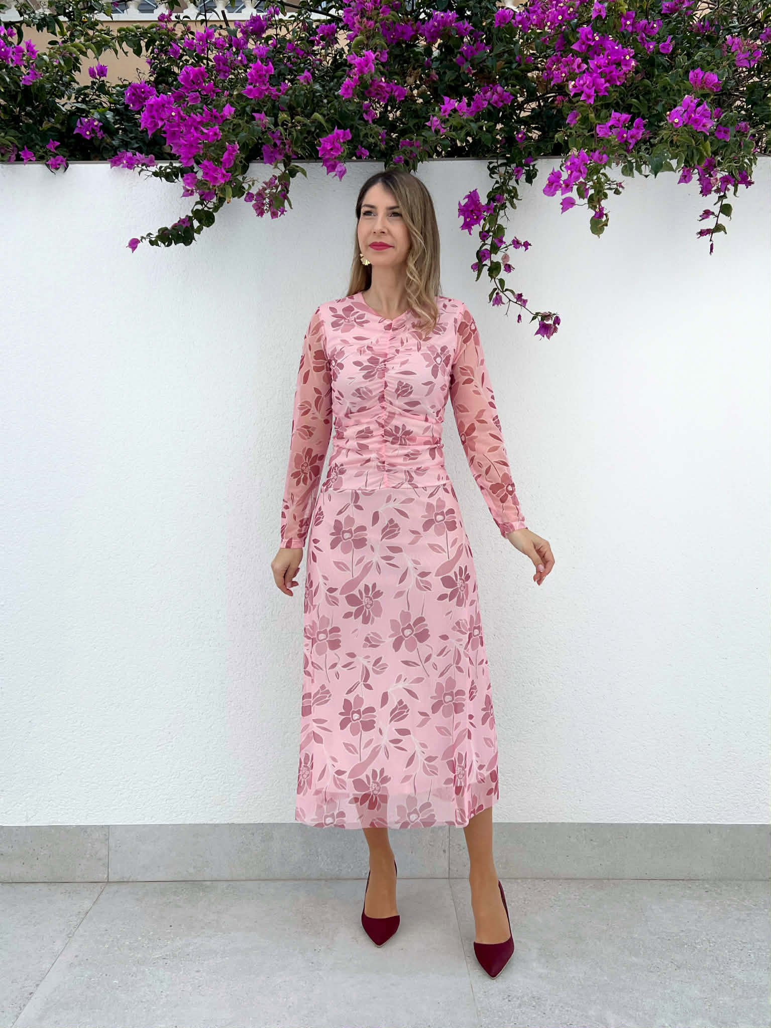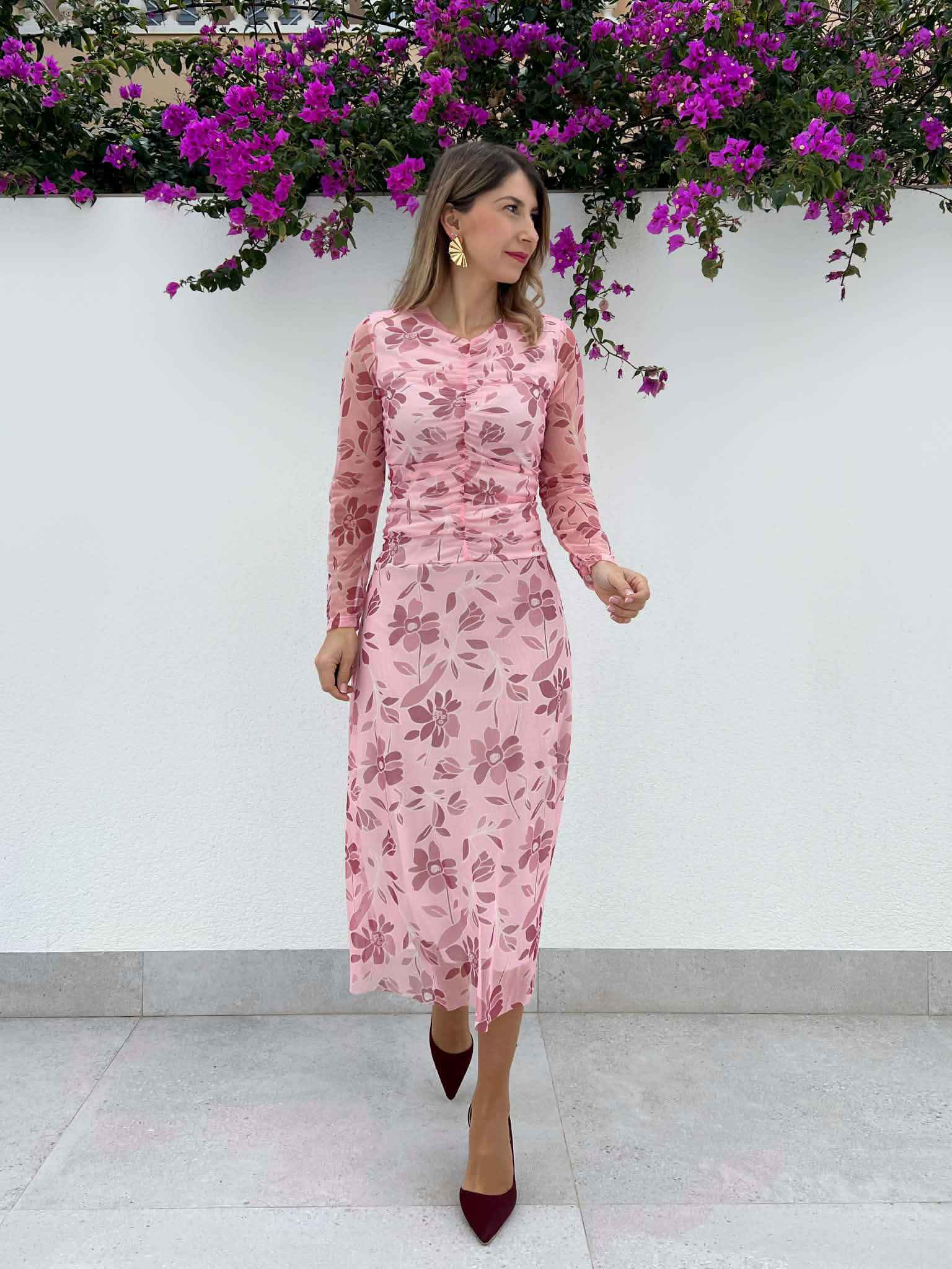 Vestido Rosa de invitada con flores color Burdeos y blanco. Tejido de tul con forro y mangas semi transparentes. Lleva fruncido frontal que disimula y estiliza. Y corte cadera con vuelo. Perfecto para bautizo, comunión, boda de día… Es un modelo cómodo y versátil, para usar después con esparteñas. Combina con Burdeos, dorado, rosa.