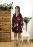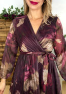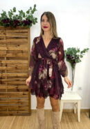 Vestido corto floral de tejido organza estampada con hilo en brillo en tonos berenjena y camel. Incluye lazada y forro interior.