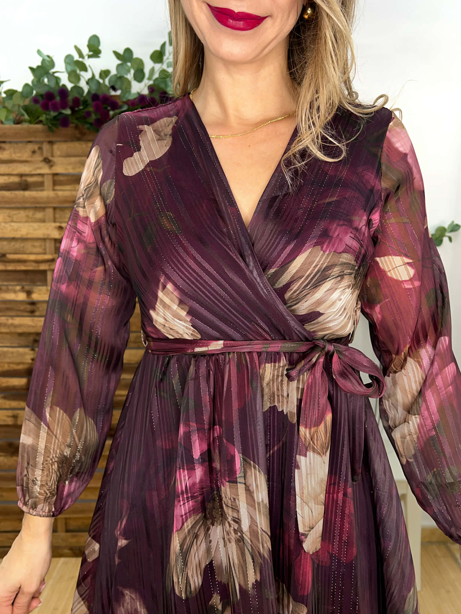 Vestido corto floral de tejido organza estampada con hilo en brillo en tonos berenjena y camel. Incluye lazada y forro interior.