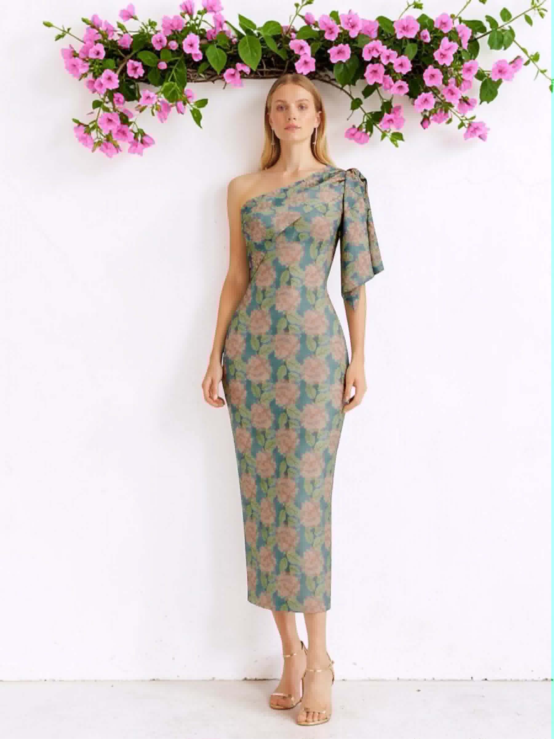 Vestido asimétrico en color agua floral en tonos verde y rosa. Detalle de lazada en e hombro. Abertura central trasera. Lleva cremallera incisible en el lateral izquierdo.
