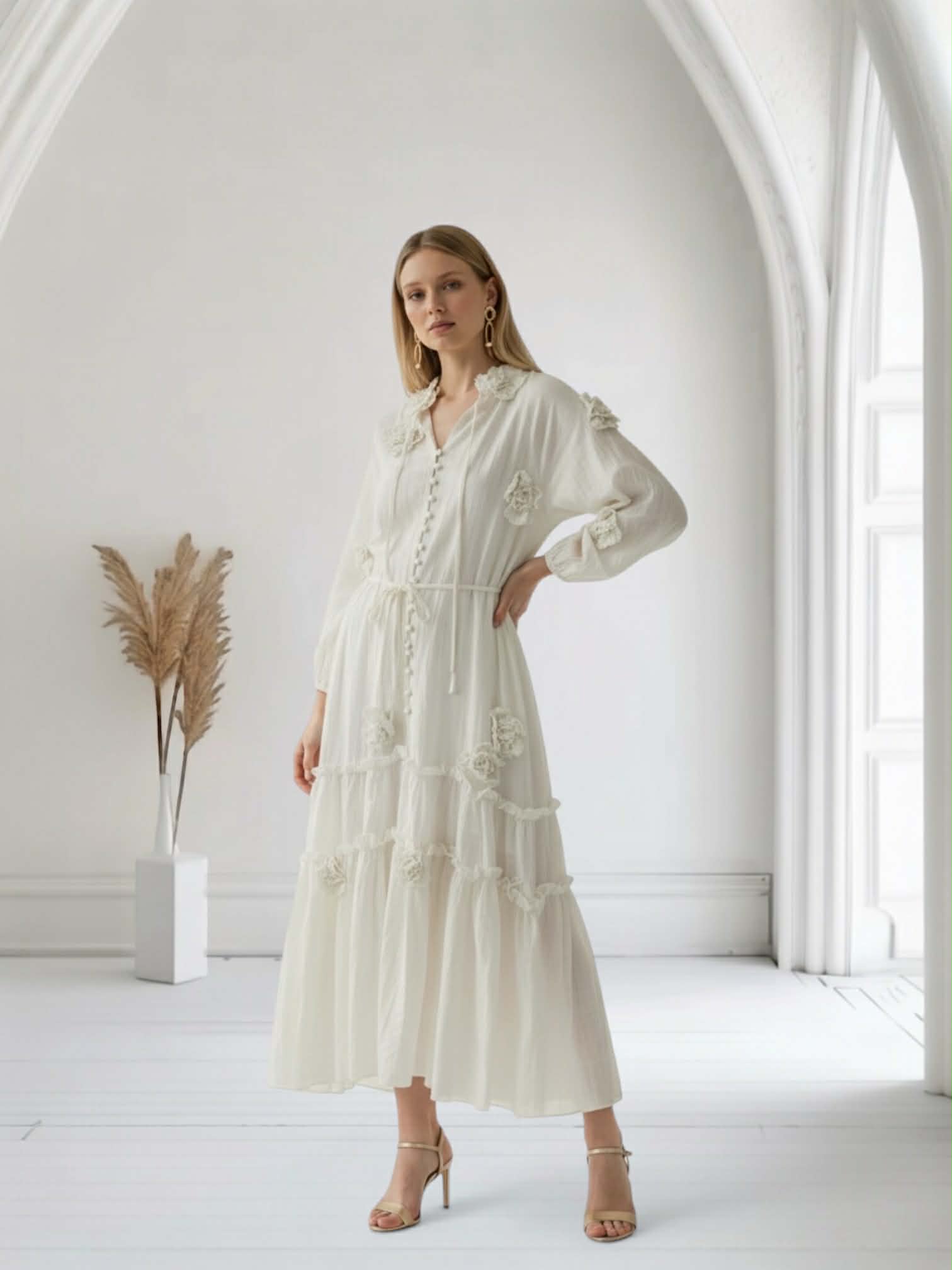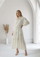 Vestido beige de tejido Tencel (similar al algodón vaporoso) fluido con detalle de flores en relieve, botones en la parte delantera central, cuerda para anudar en el cuello, lazada en la cintura para ajustar y volantes en el bajo.