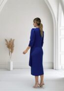 Vestido midi azul de tejido crepé, escote cruzado y lazada en la cintura. Contiene forro interior y cremallera invisible trasera. Incluye hombreras.
