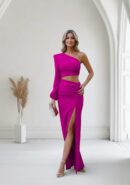 Vestido de fiesta largo buganvilla cut out con escote asimétrico en manga larga con hombrera y botones laterales negros en el lateral sin manga. Fruncido lateral y abertura hasta medio muslo. Lleva cremallera invisible trasera en la falda.