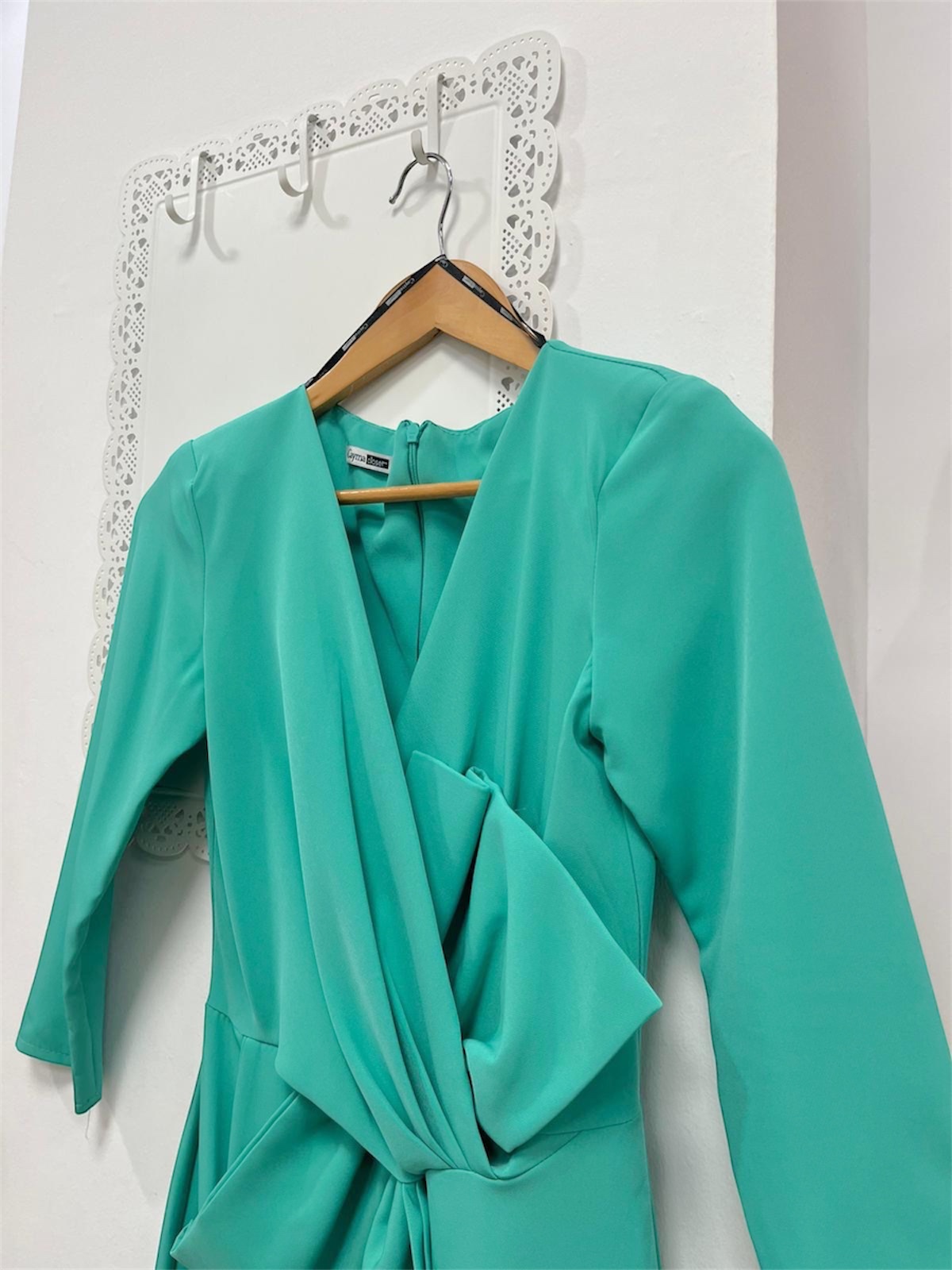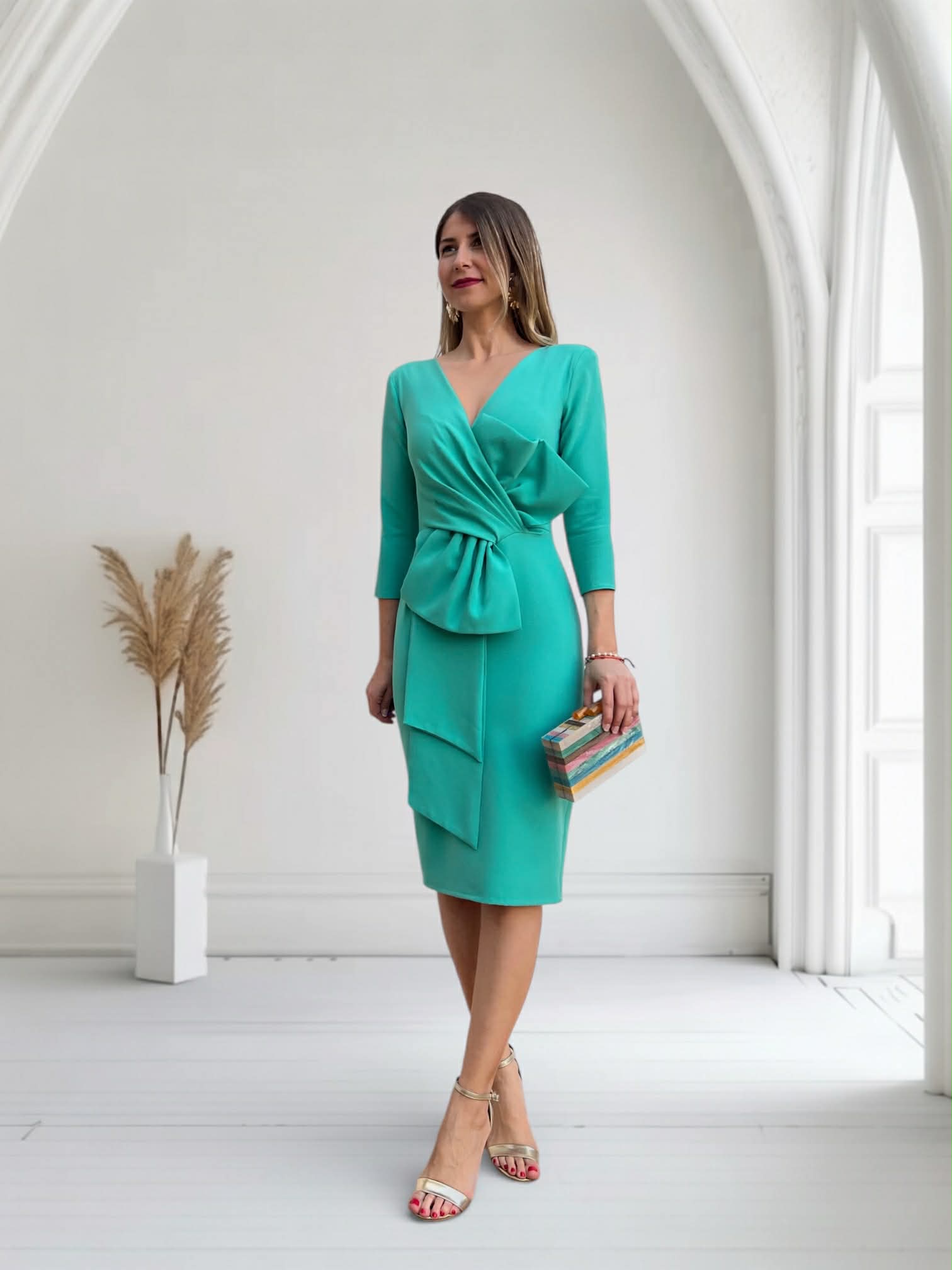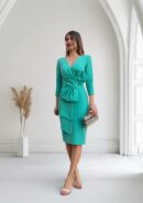 Vestido de fiesta con manga tres cuartos y lazo decorativo en la parte delantera. Cremallera invisible en la espalda y abertura en el bajo (parte trasera). Color verde. *No lleva forro.