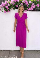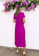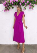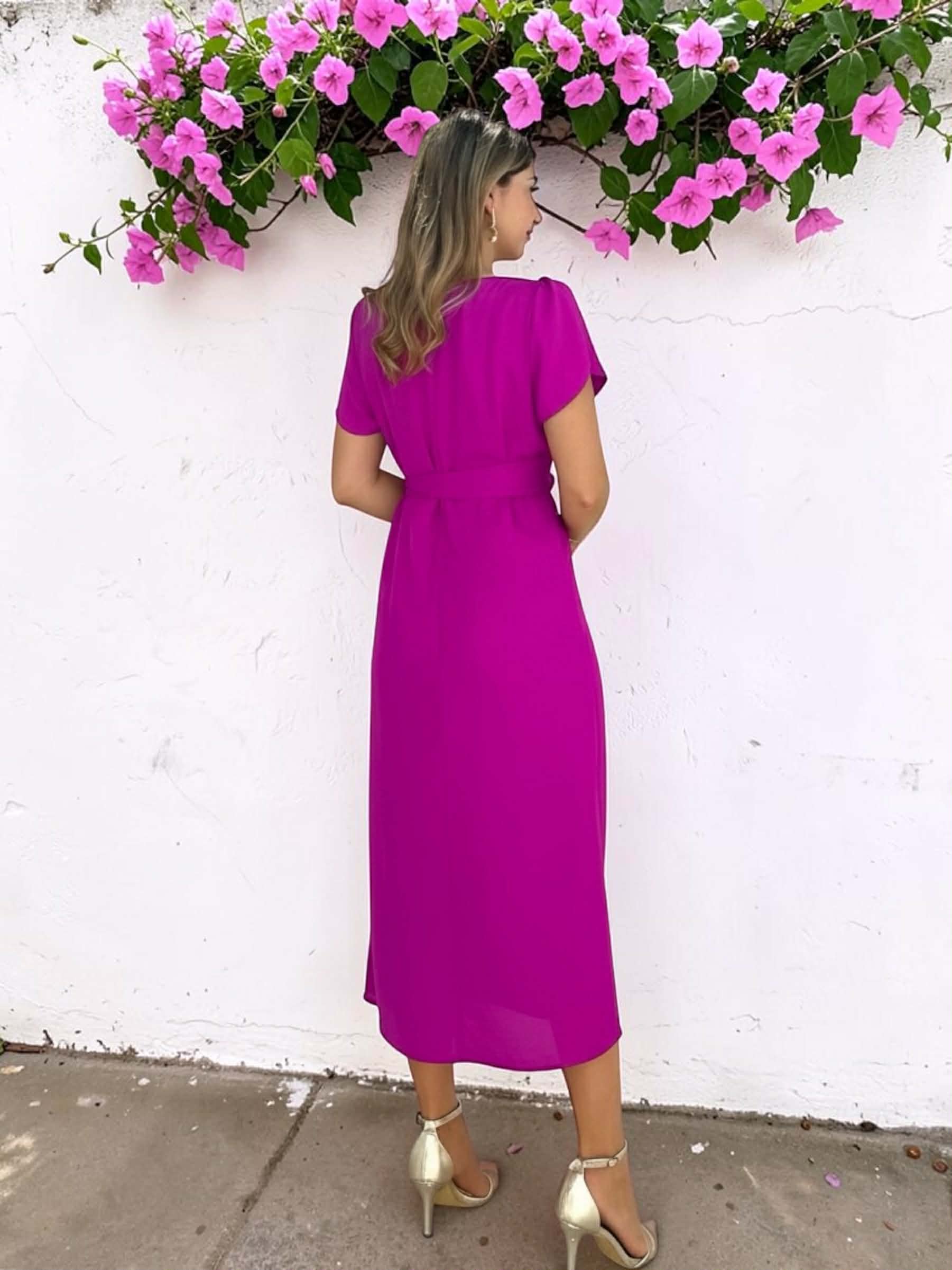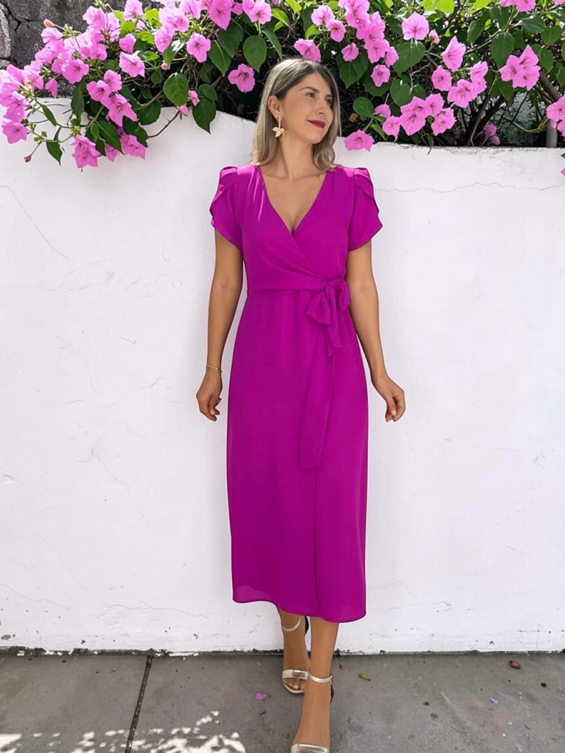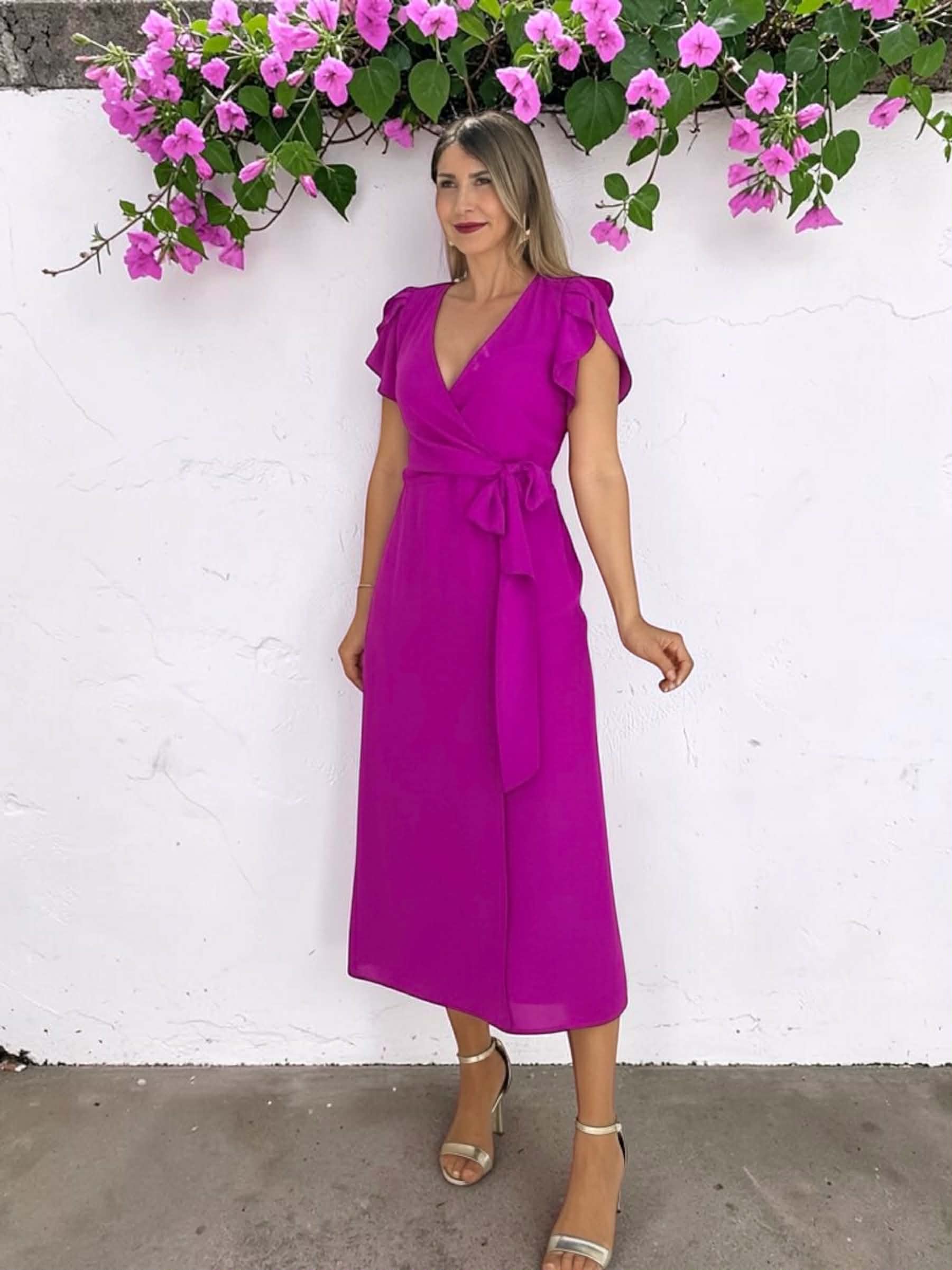 Vestido midi de manga corta buganvilla con mangas tipo volantillo, escote cruzado y lazada en la cintura. Contiene forro interior y cremallera invisible lateral.