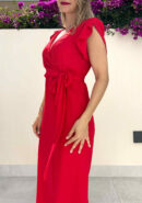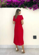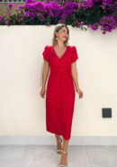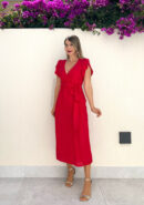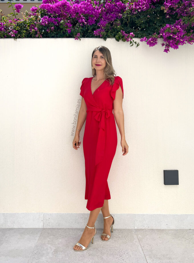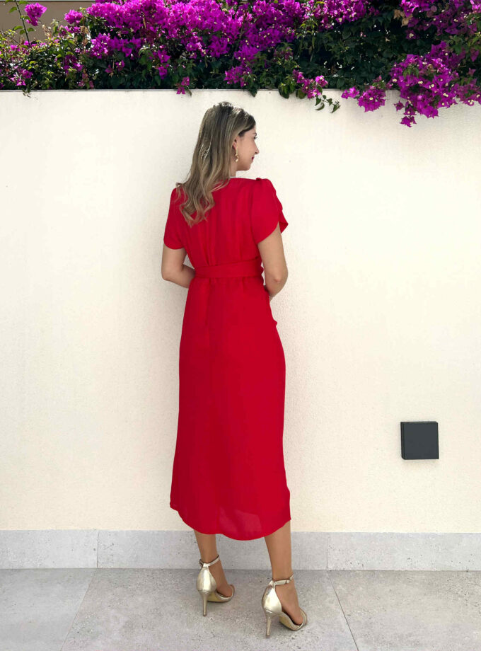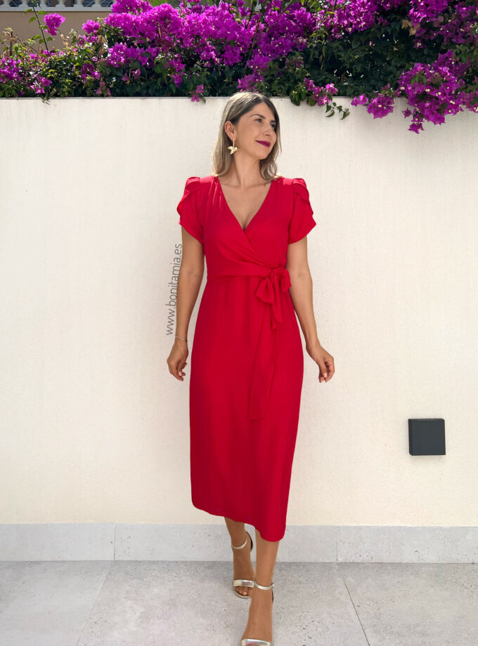 Vestido midi de manga corta rojo con mangas tipo volantillo, escote cruzado y lazada en la cintura. Contiene forro interior y cremallera invisible lateral.
