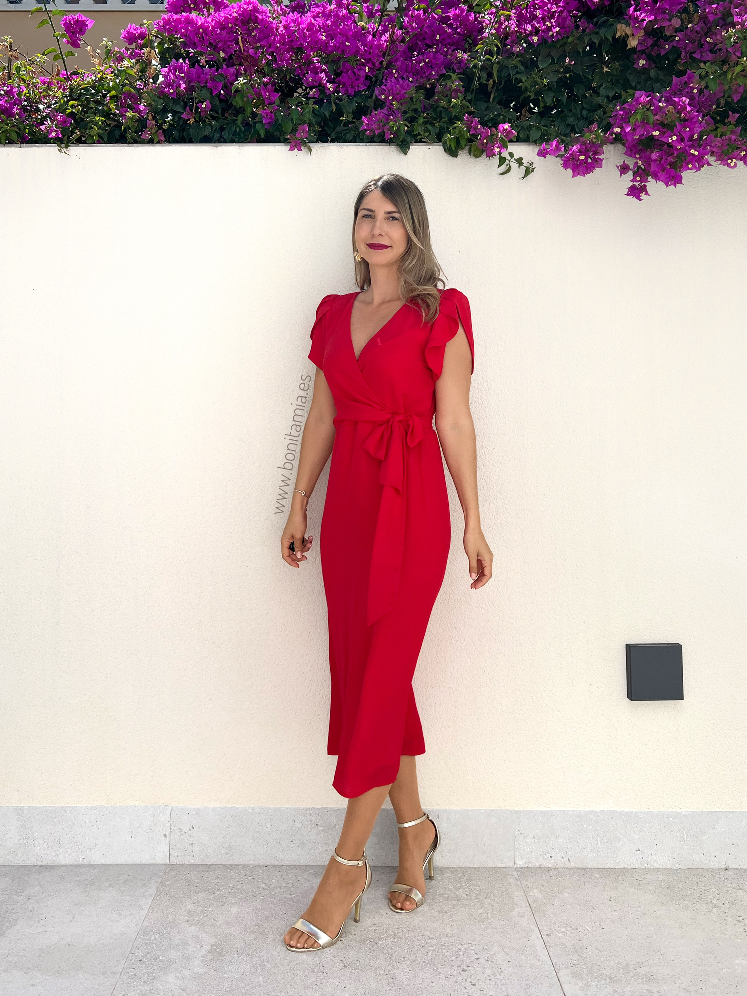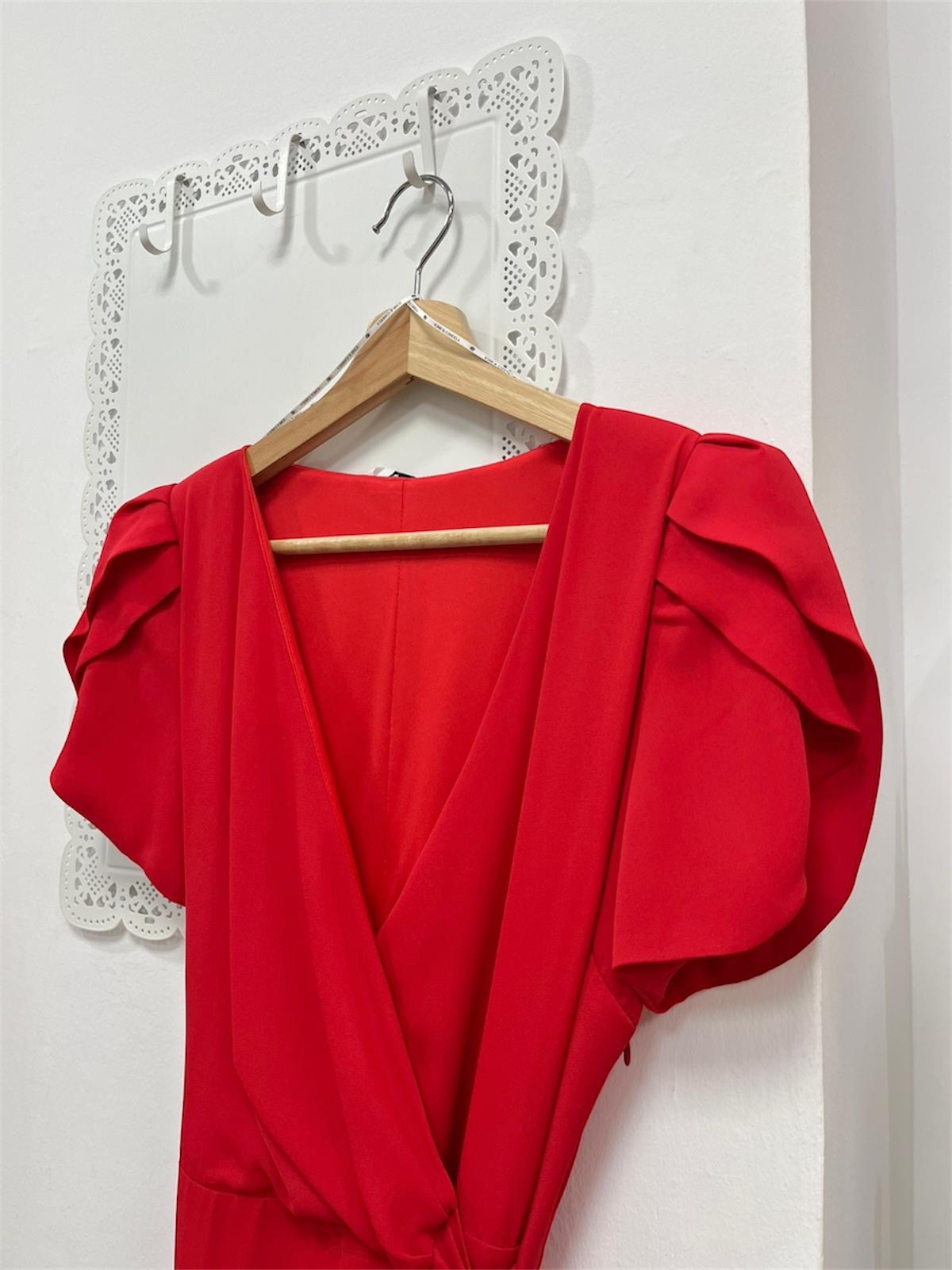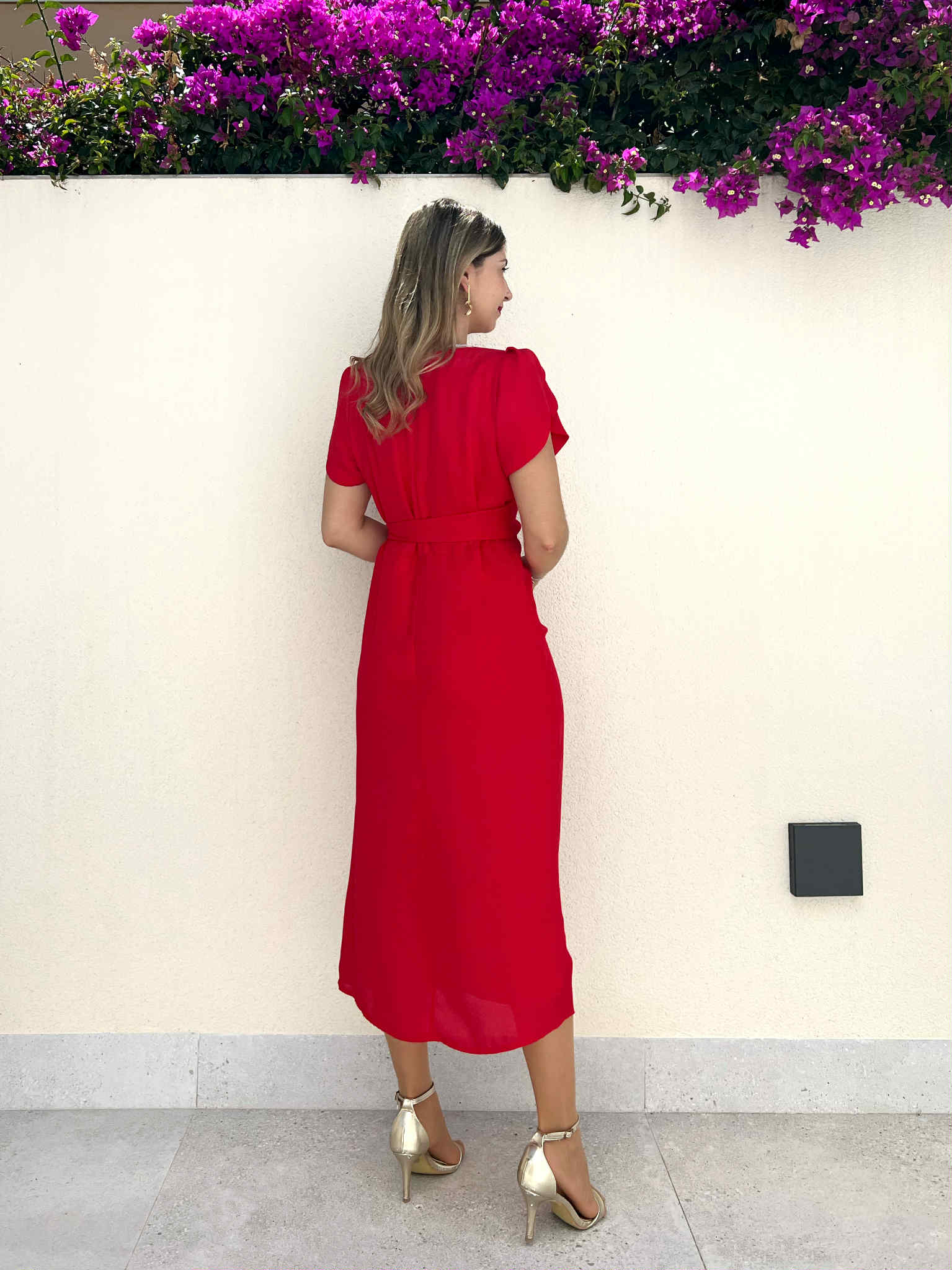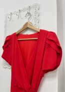 Vestido midi de manga corta rojo con mangas tipo volantillo, escote cruzado y lazada en la cintura. Contiene forro interior y cremallera invisible lateral.