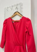 Vestido de fiesta midi con manga 3/4 con escote cruzado, pequeña abertura en la parte delantera lateral y detalle de volante en cintura. Lleva cremallera invisible trasera. Incluye forro interior.