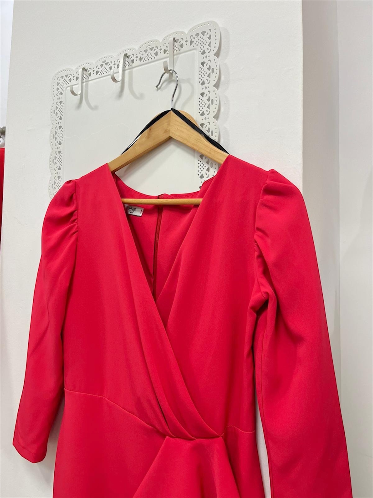 Vestido de fiesta midi con manga 3/4 con escote cruzado, pequeña abertura en la parte delantera lateral y detalle de volante en cintura. Lleva cremallera invisible trasera. Incluye forro interior.