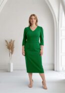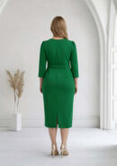 Vestido de fiesta de corte midi, manga tres cuartos abullonada en el hombro y escote en pico. Lleva cinturón del mismo color y tejido que el vestido. *No lleva forro. Cremallera invisible lateral. Color verde.