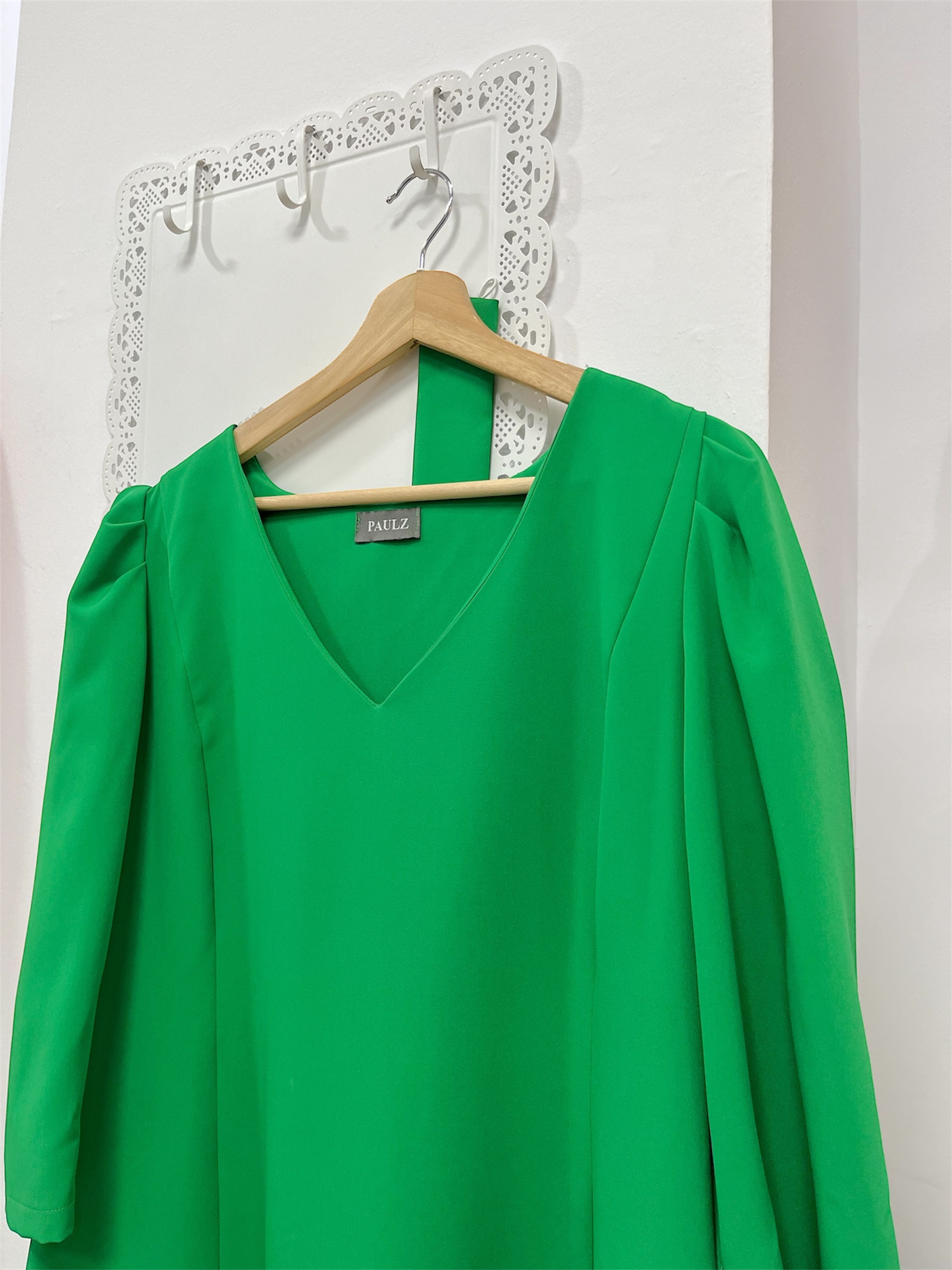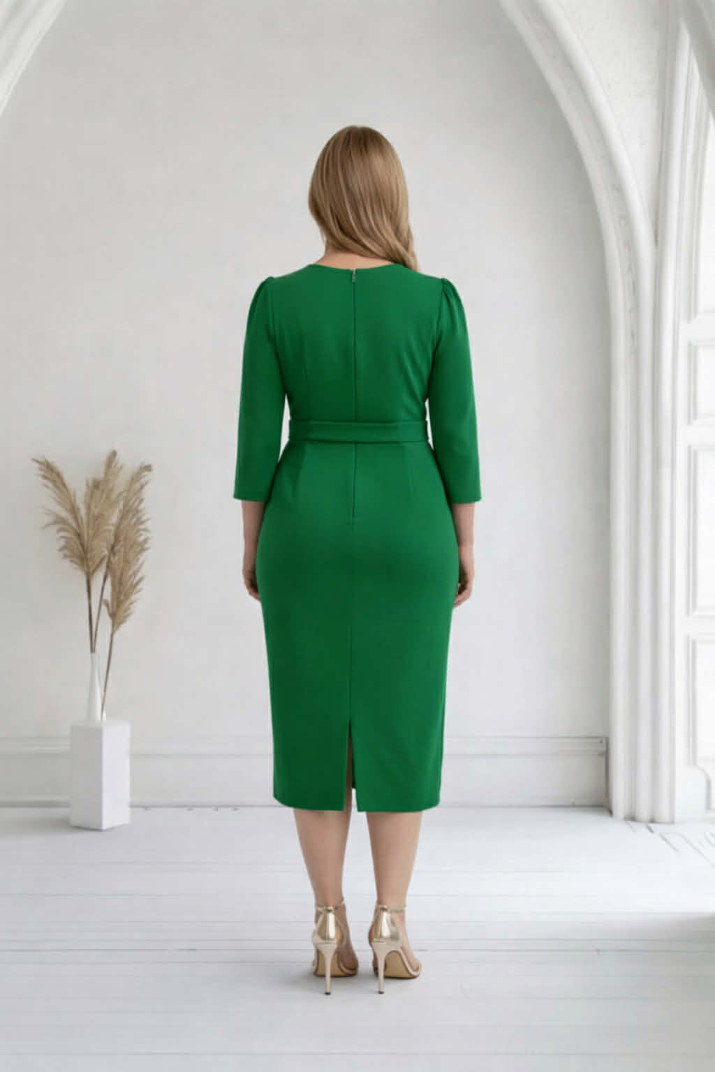 Vestido de fiesta de corte midi, manga tres cuartos abullonada en el hombro y escote en pico. Lleva cinturón del mismo color y tejido que el vestido. *No lleva forro. Cremallera invisible lateral. Color verde.