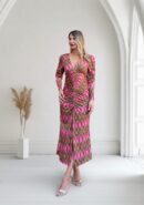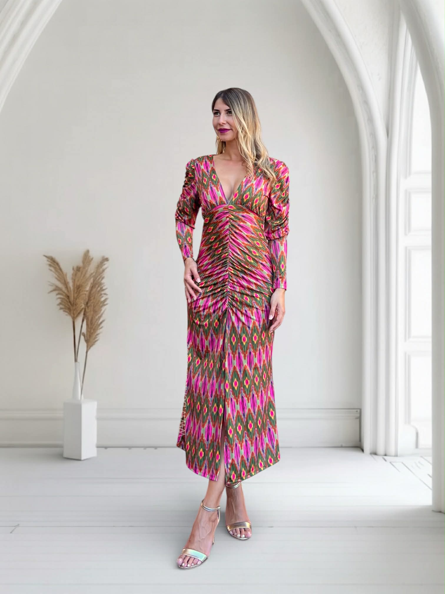 Vestido midi estampado en tonos buganvilla, verde militar, fucsia, teja… con escote en pico, mangas abullonadas con fruncido, fruncido en la cintura y abertura delantera. Tejido licra fría (fino y muy elástico).