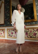 Vestido midi en color crudo de tejido crep con manga de gasa 3/4 con detalle de lazo, escote en pico y detalle de cenefa en la parte delantera y trasera. Cremallera invisible trasera y abertura central trasera. Incluye hombreras y forro interior.