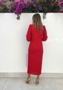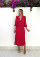 Vestido midi rojo de gasa y manga cruzado y goma en el puño. Contiene forro interior y cremallera invisible lateral.