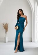 Vestido largo petróleo de corte sirena asimétrico con falda cruzada y detalle de nudo en la cintura. Lleva cremallera trasera invisible. Tejido licra satinada.