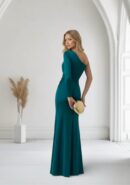 Vestido largo petróleo de corte sirena asimétrico con falda cruzada y detalle de nudo en la cintura. Lleva cremallera trasera invisible. Tejido licra satinada.