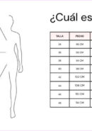 - Talla 38: pecho desde 90 cm hasta 94 cm, cintura desde 74 cm hasta 78 cm, cadera desde 96 cm hasta 100 cm, largo desde hombro 121 cm.