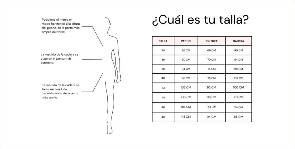 - Talla 48: pecho desde 110 cm hasta 114 cm, cintura desde 94 cm hasta 98 cm, cadera desde 116 cm hasta 120 cm, largo desde hombro 124 cm