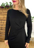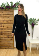 Vestido midi en tejido de punto lana elástico en color negro de manga larga, detalle de nudo cogido en lateral izquierdo y pequeña abertura delantera.
