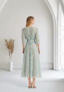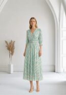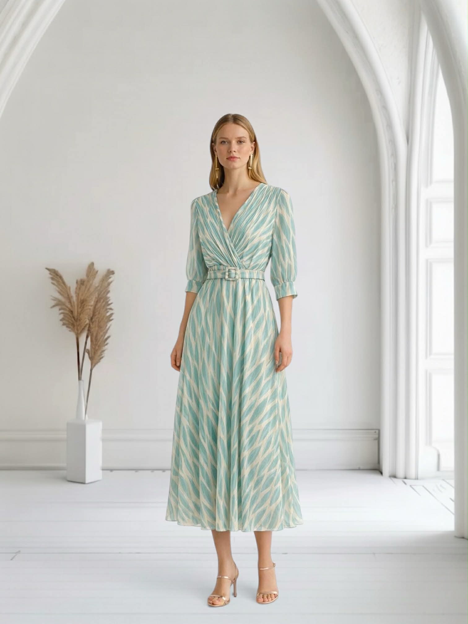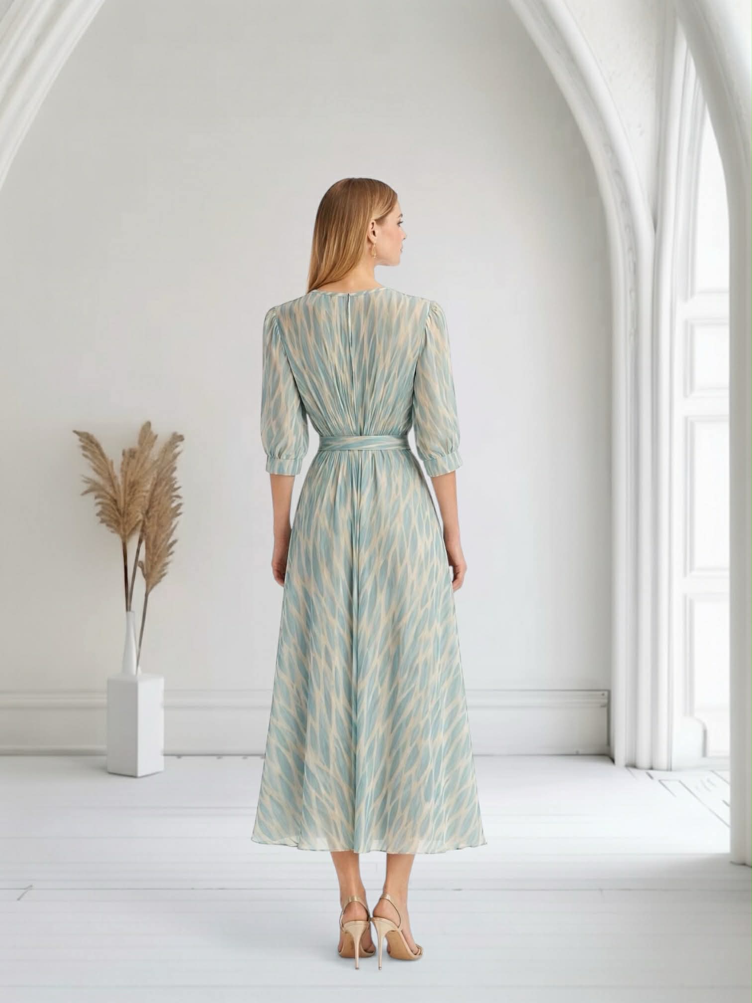 Vestido midi en tonos agua y beige de gasa con manga larga, escote cruzado plisado y goma en la cintura. Incluye forro interior.