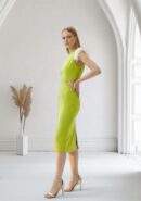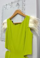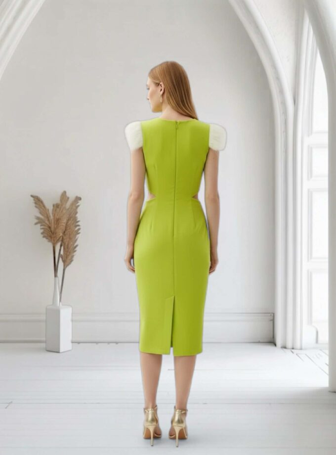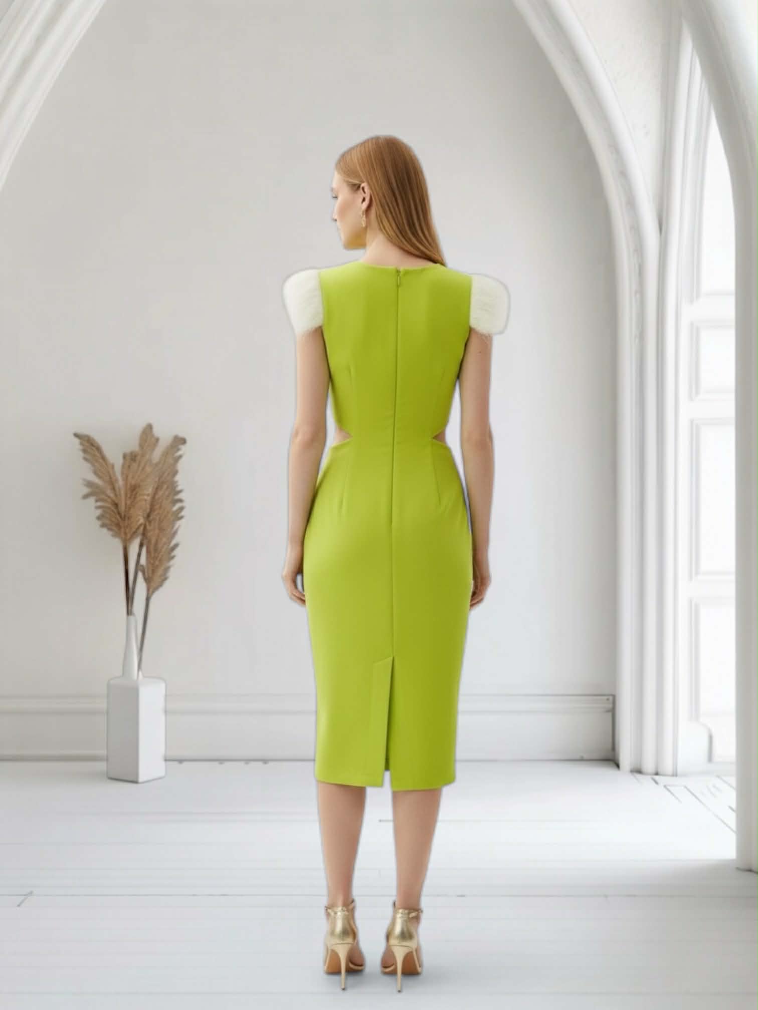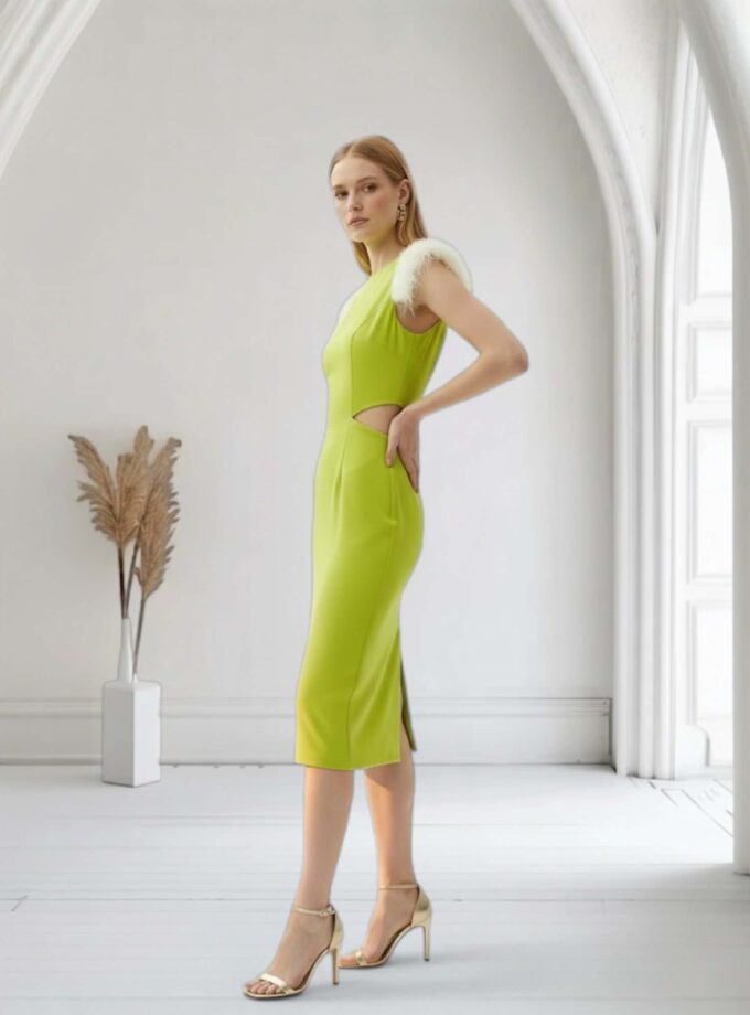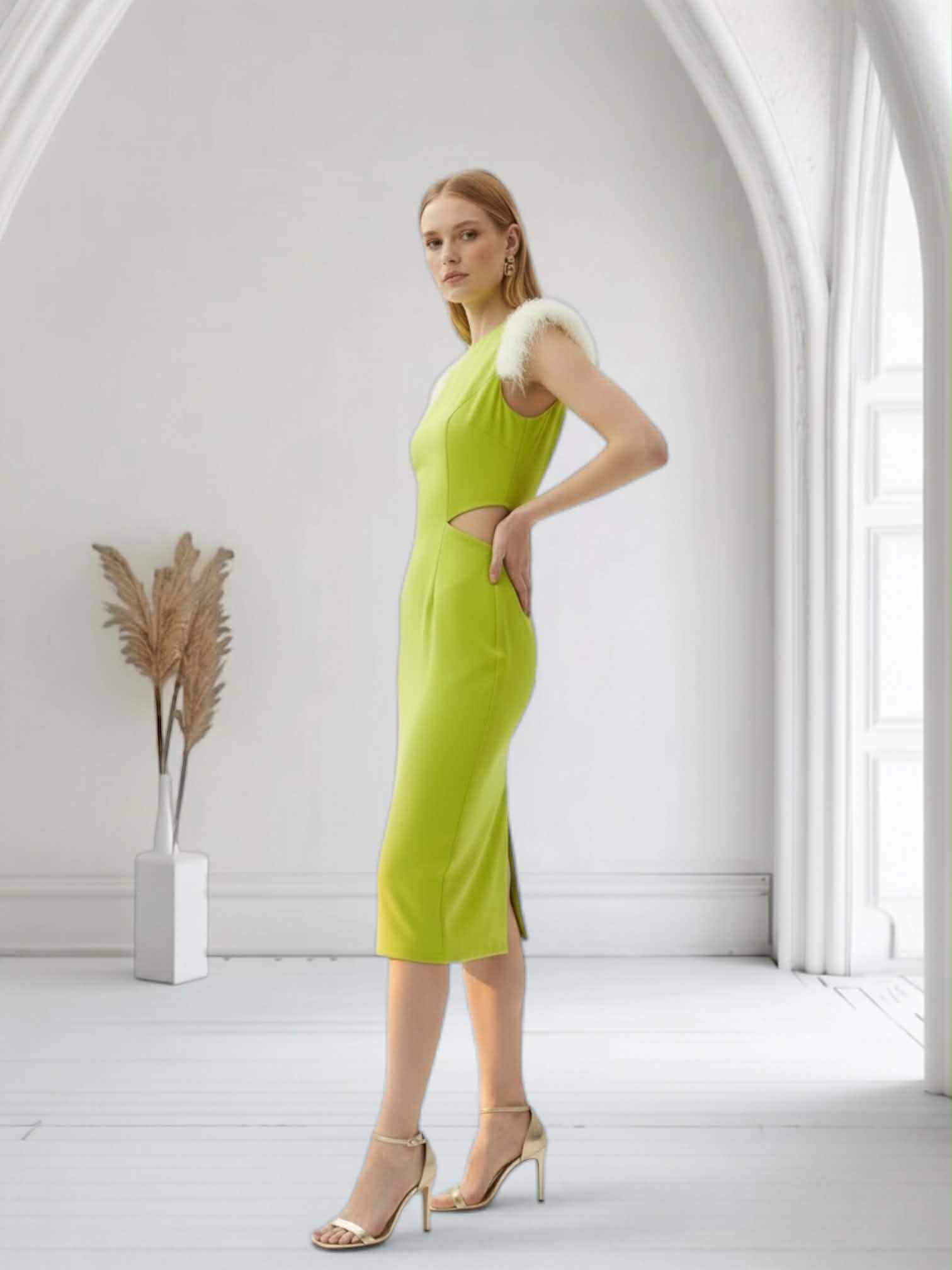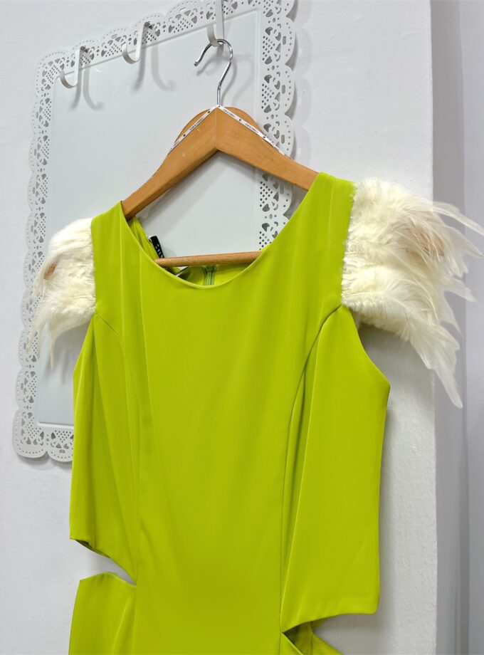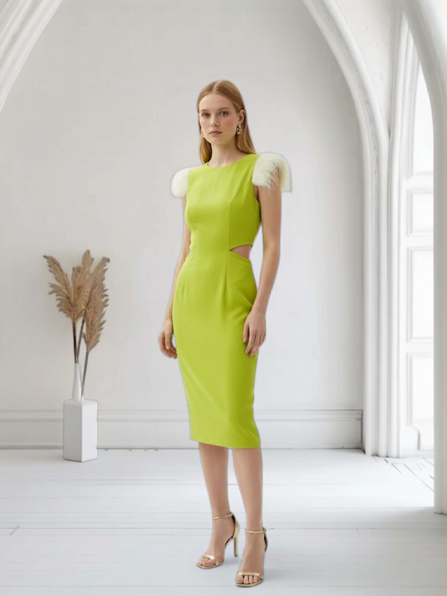 Vestido lima midi de fiesta con plumas en color beige en la manga sisa y cut out en la cintura. Lleva cremallera invisible trasera y abertura en el bajo. Contiene forro interior.