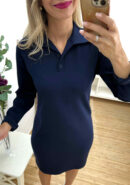 Vestido corto azul marino de manga larga, solapas en el cuello y cierre de dos botones.