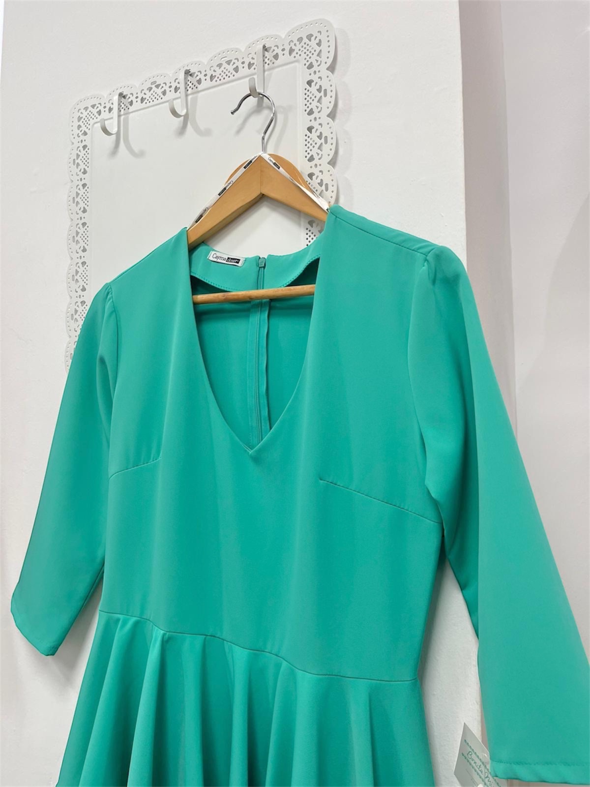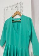 Vestido midi de fiesta verde aguamarina con escote en V, manga 3/4 y detalle de volante asimétrico en la cintura. LLeva cremallera invisible trasera y abertura trasera.