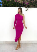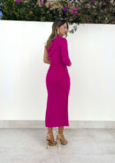 Vestido midi buganvilla de punto seda (elástico) asimétrico con fruncido y abertura lateral. Lleva cremallera lateral invisible y forro interior.