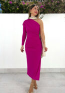 Vestido midi buganvilla de punto seda (elástico) asimétrico con fruncido y abertura lateral. Lleva cremallera lateral invisible y forro interior.