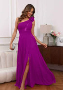 Vestido buganvilla largo, con tejido de gasa, corte asimétrico y transparencia de tul en el pecho. Tiene detalle de 3 flores en el hombro fijadas con imperdibles independientes. Parte de la espalda cruzada con abertura y cremallera invisible. Abertura en la parte lateral delantera. Incluye cascos y forro interior.