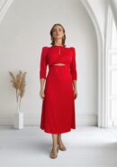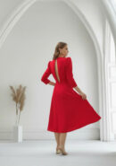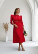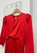 Vestido de fiesta midi en color rojo con caída de semiescote cruzado con abertura frontal en la zona de la cintura, manga abullonada, hombreras y espalda abierta. Contiene forro interior y cremallera trasera invisible.