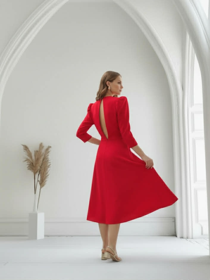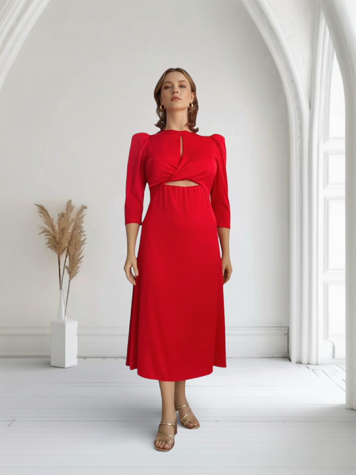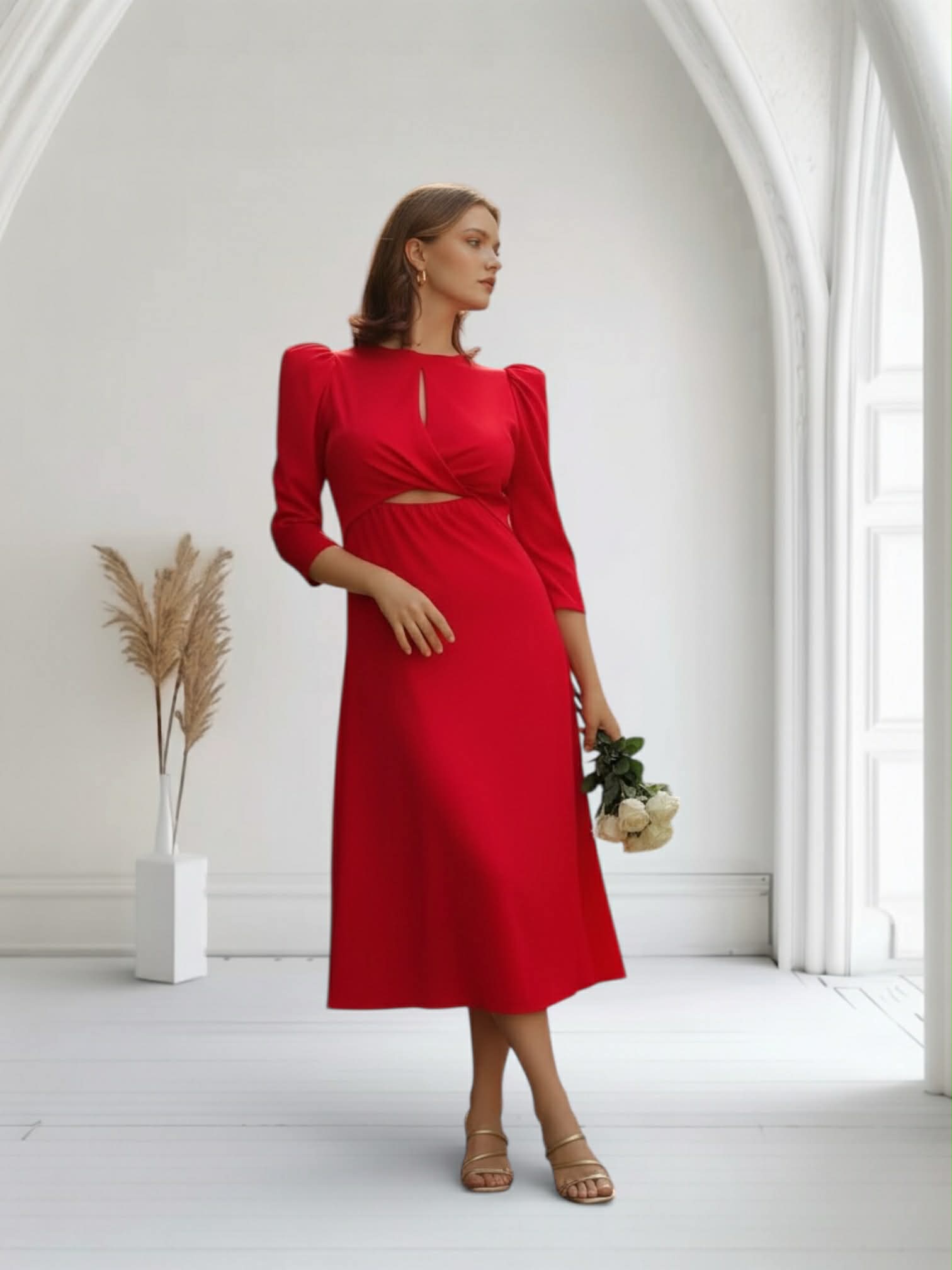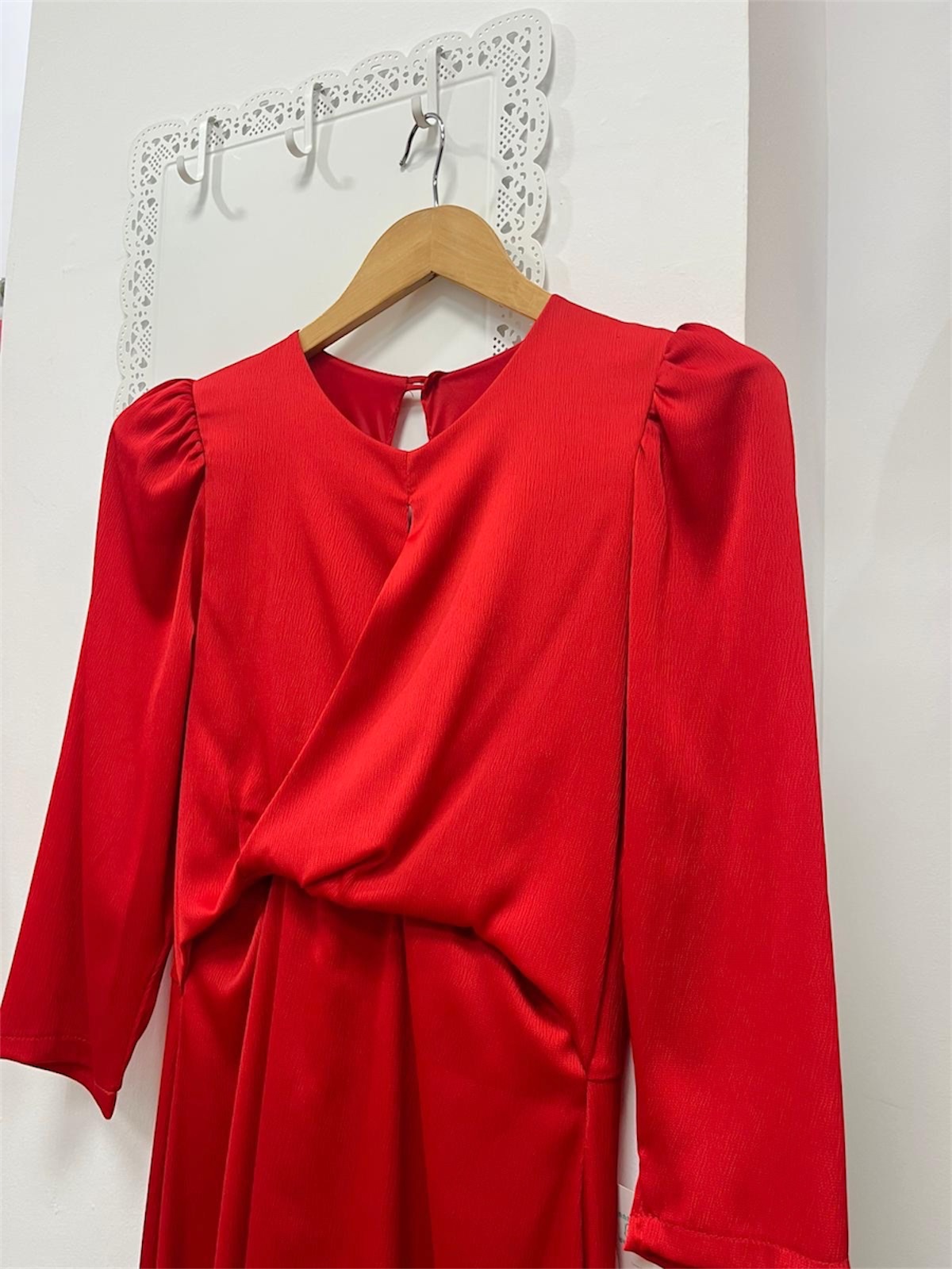 Vestido de fiesta midi en color rojo con caída de semiescote cruzado con abertura frontal en la zona de la cintura, manga abullonada, hombreras y espalda abierta. Contiene forro interior y cremallera trasera invisible.