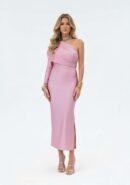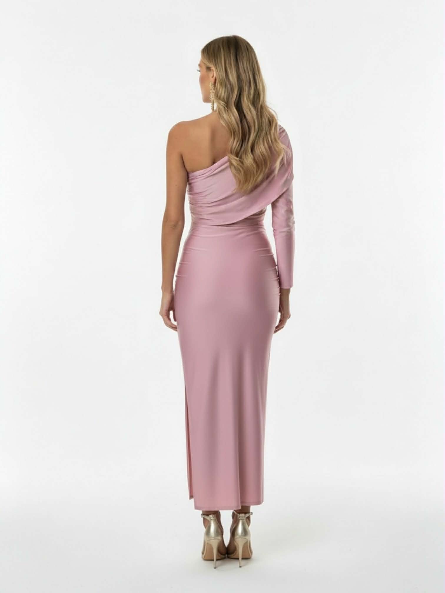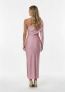 Vestido midi de licra en color rosa nude asimétrico de manga larga, fruncido en laterales y abertura lateral izquierda.