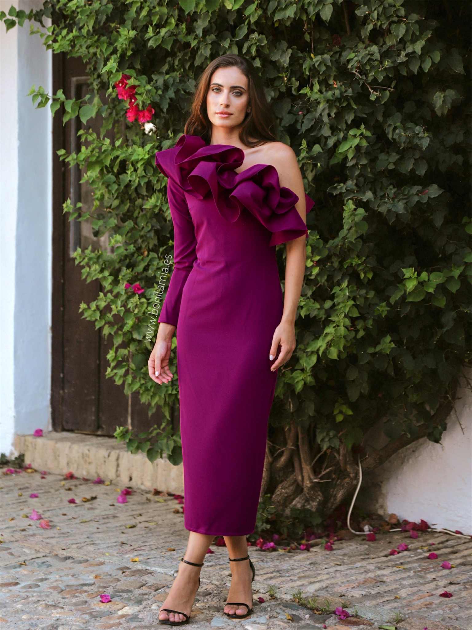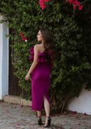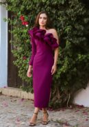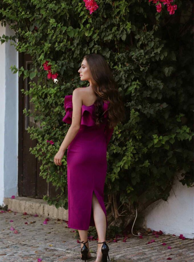 Vestido midi berenjena asimétrico de manga larga con volante en tafetán del mismo tono. Lleva forro interior, cremallera invisible lateral y abertura trasera.