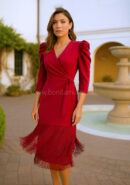 Vestido midi rojo con manga 3/4, escote cruzado anudado al lateral izquierdo y flecos en el bajo de la falda. Cremallera invisible trasera y abertura central trasera. Incluye forro interior. Tejido bilástico, crep suave que da cuerpo y grosor al tejido. (Similar al de una blazzer)