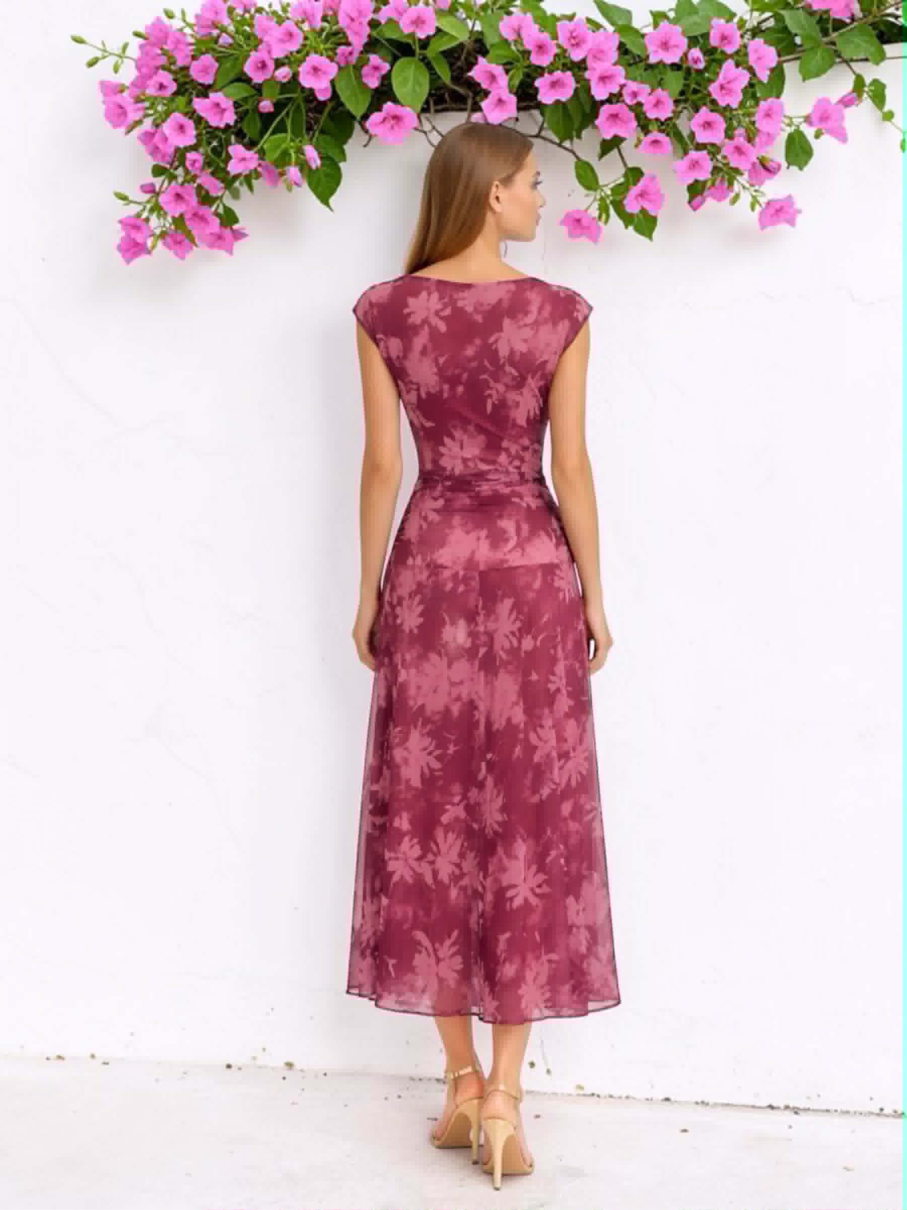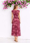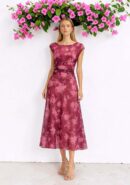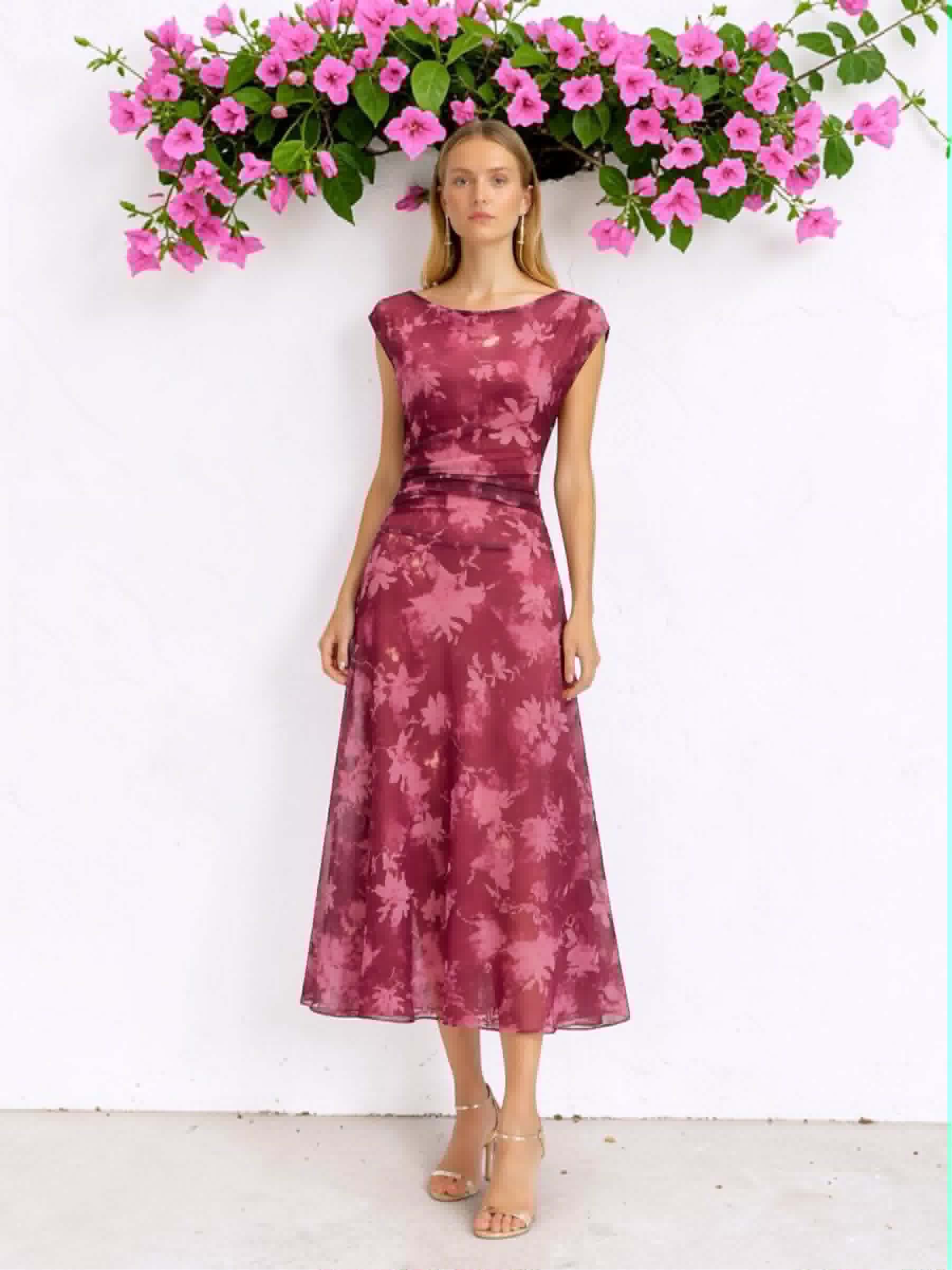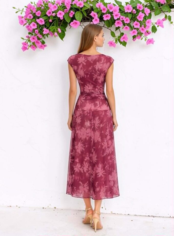Vestido en color cereza floral en rosa. Tejido de tul con forro interior. Lleva fruncido frontal que disimula y estiliza. Y corte cadera con vuelo. Perfecto para bautizo, comunión, boda de día…