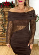 Vestido corto de licra marrón chocolate con escote bardot, strass y fruncidos laterales. Incluye top bandeau.