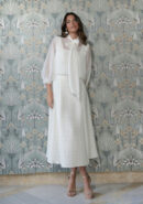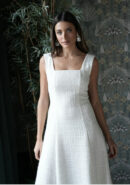 Vestido midi beige de vuelo y tejido tweed con escote cuadrado. Incluye blusa de organza y lazada. Lleva forro interior y cremallera interior trasera.