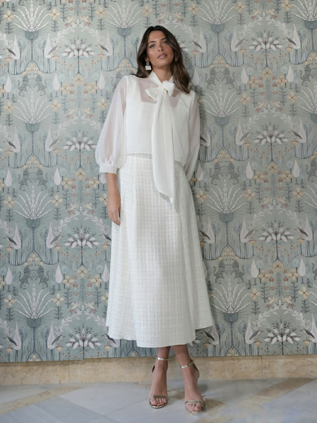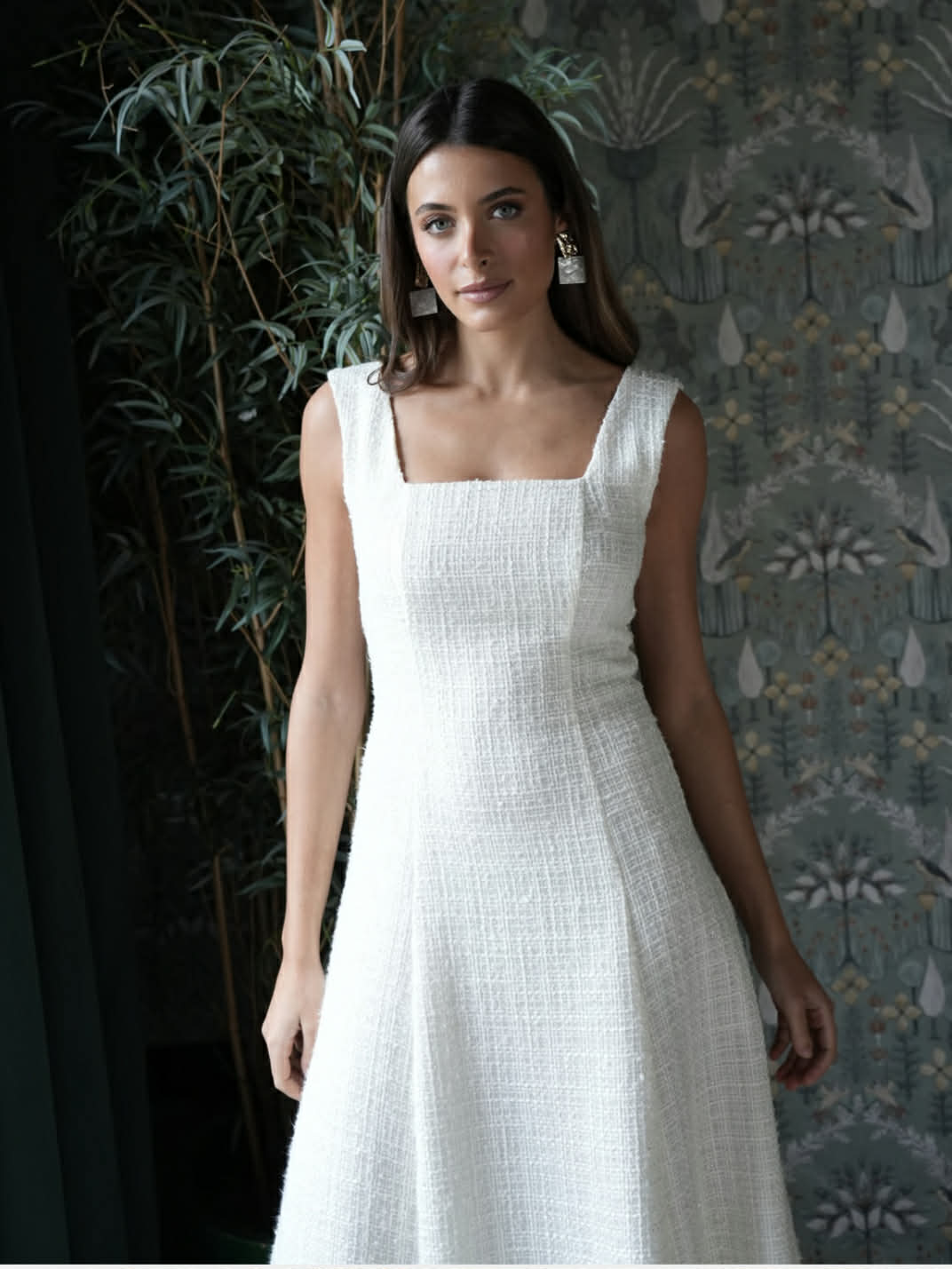 Vestido midi beige de vuelo y tejido tweed con escote cuadrado. Incluye blusa de organza y lazada. Lleva forro interior y cremallera interior trasera.