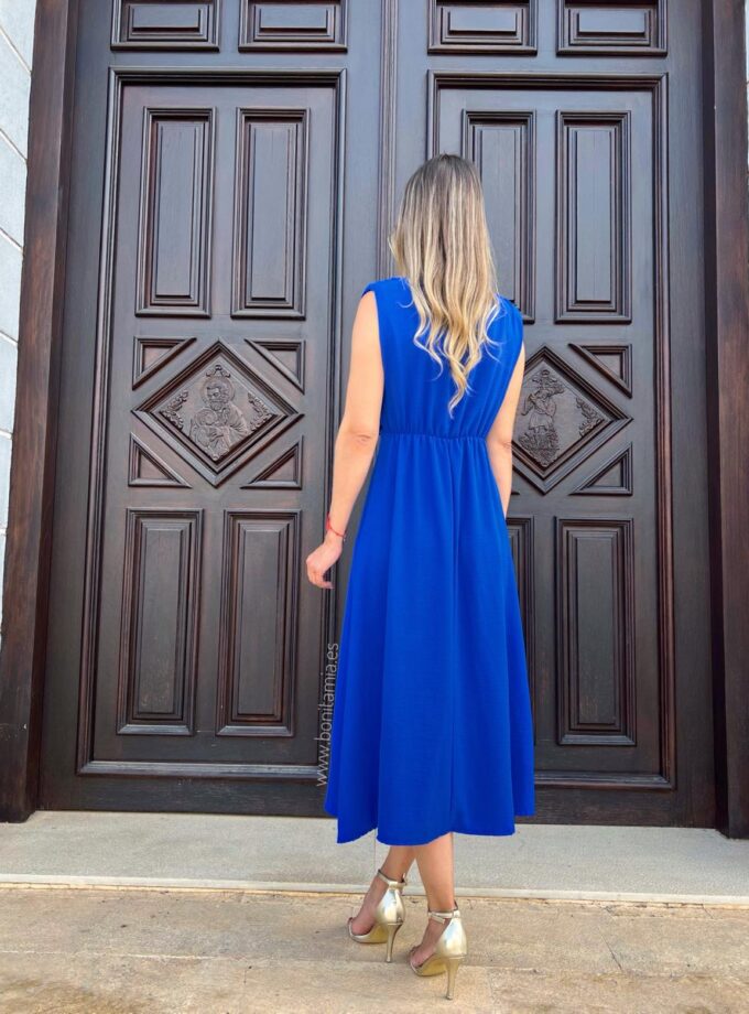 Vestido midi azul para evento. Tiene tejido fluido, hombreras, escote en gota con botón, lazada decorativa y goma en la cintura.
