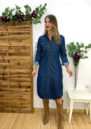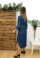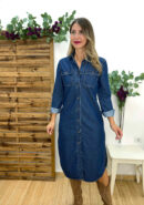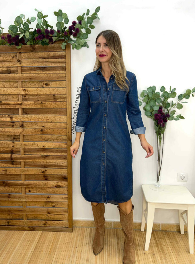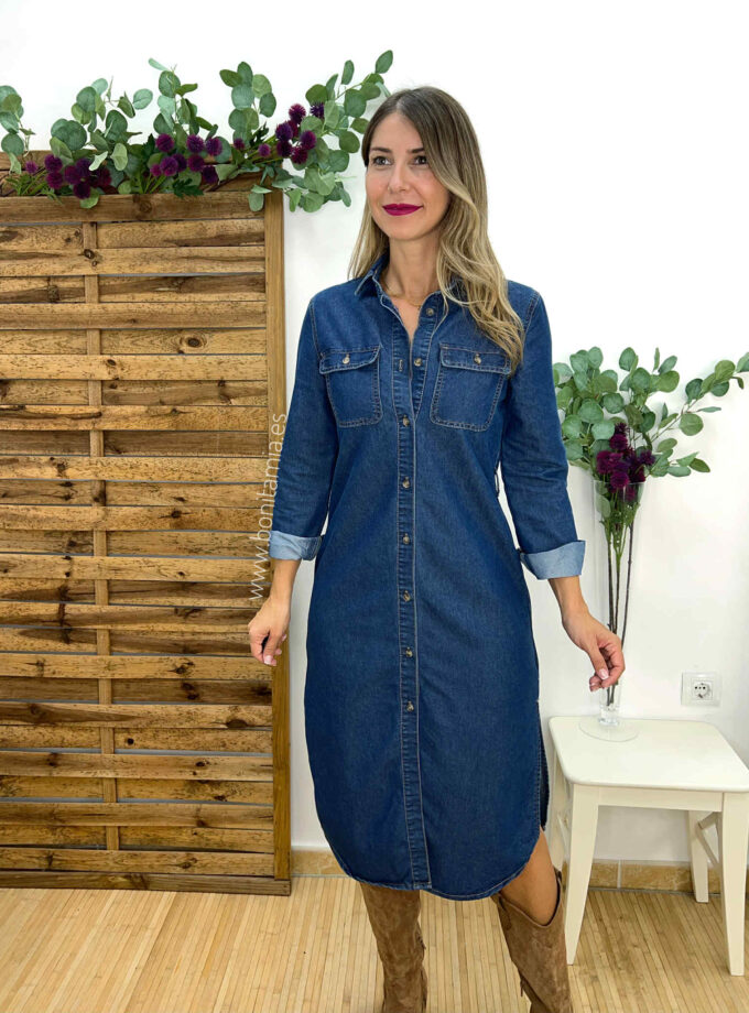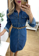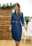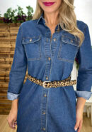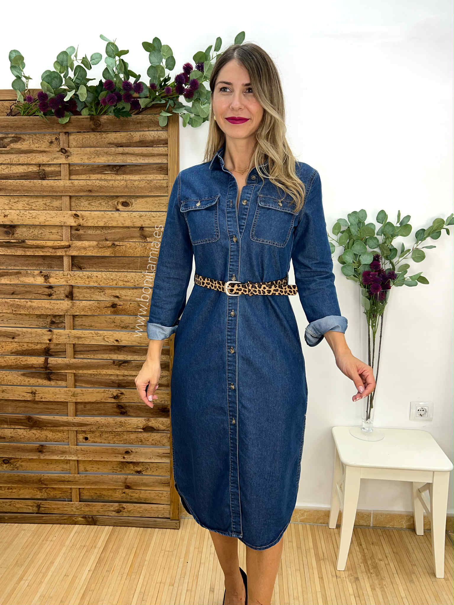 Vestido midi vaquero de manga larga regulable con bolsillos en la parte delantera y parte trasera más larga. Cinturón polipiel estampado leopardo incluido.