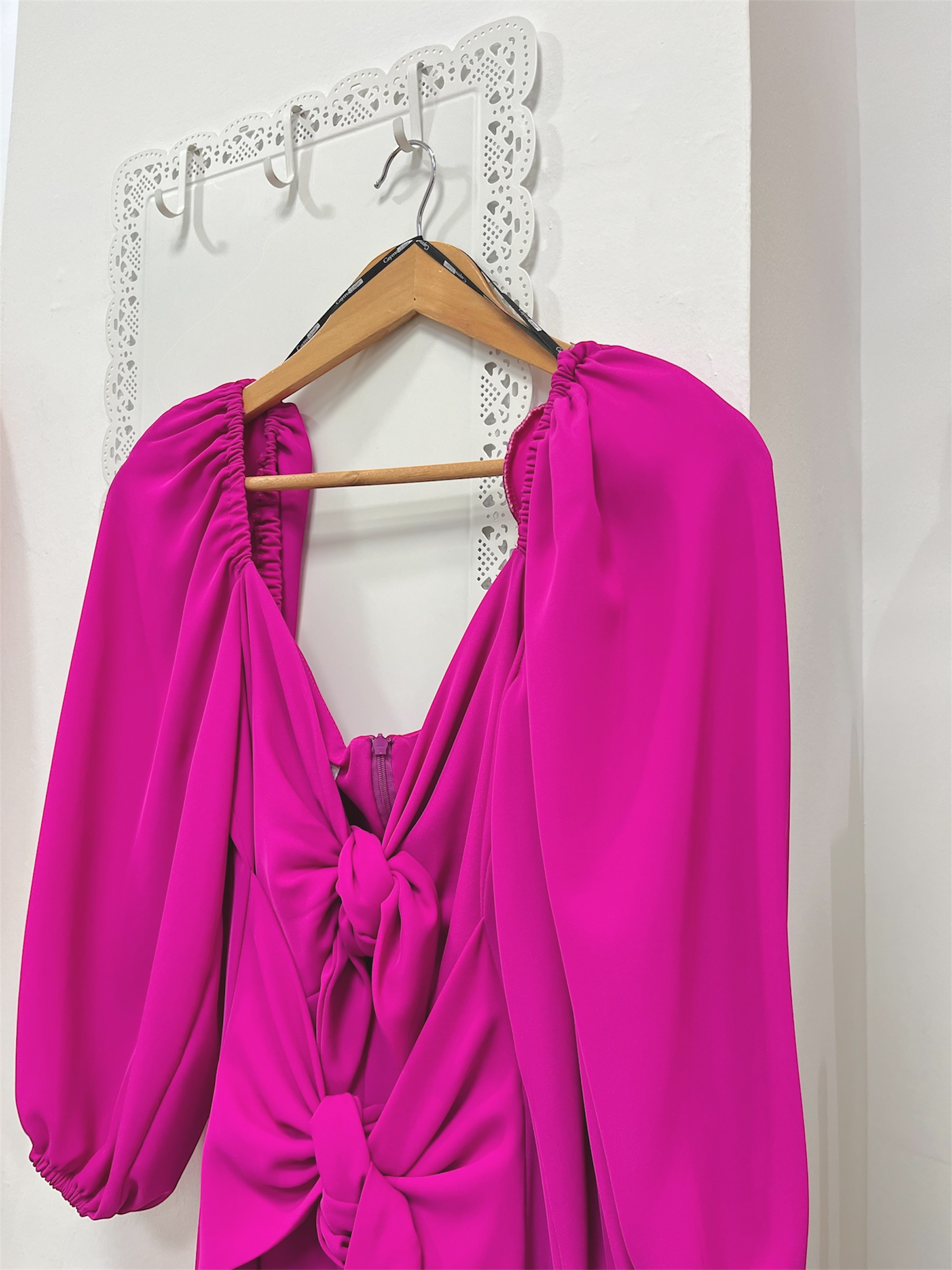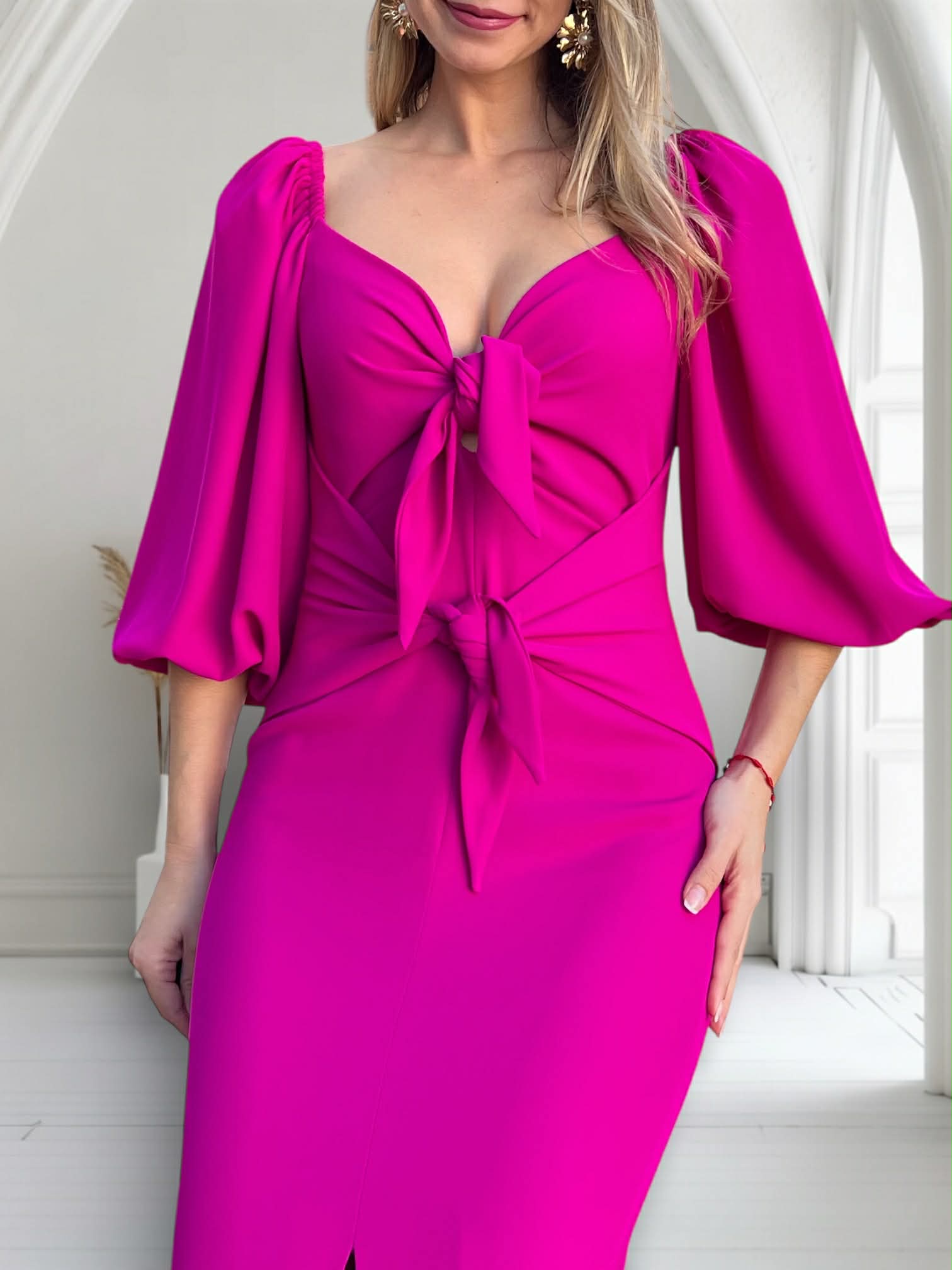 Vestido de fiesta midi con mangas abullonadas y detalle en pecho y cintura de lazada. Tiene abertura en la parte delantera central y cremallera invisible trasera. Incluye forro interior.