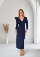 Vestido midi azul marino con volante de tafetán, fruncido en la barriga que disimula y cuello en pico. Tiene cremallera invisible trasera y raja.