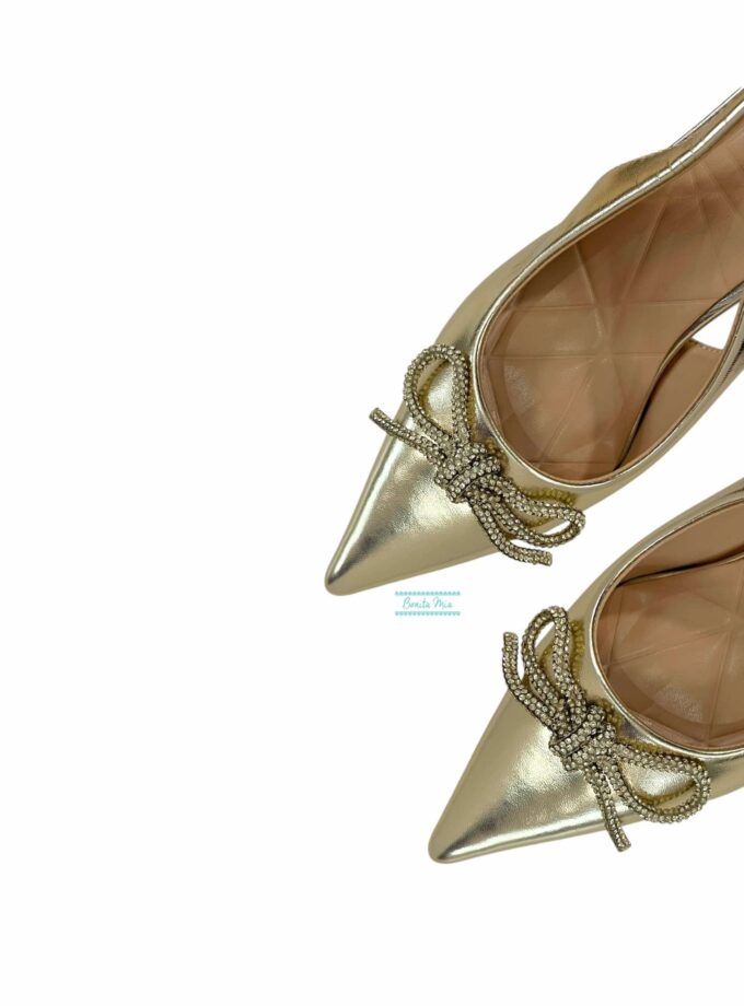 Zapato dorado de salón destalonado con detalle de lazo en strass dorado.