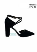 Zapato negro de antelina con tacón y doble pulsera brillante al tobillo de punta.